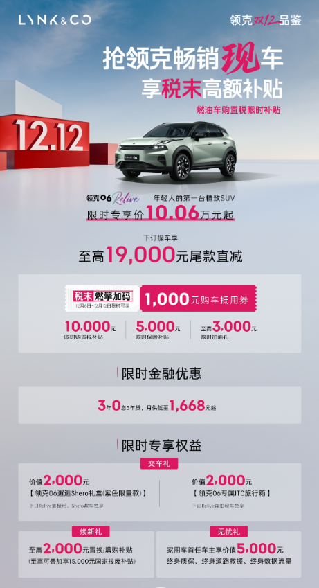 临近年底,领克06 Relive推出了一系列购车优惠政策。目前车辆限时专享价为10.06万元起。在12月6日至12月12日期间,通过领克官方直播间下订的用户可获得1000元购车抵用券,并可享受购置税补贴、保险补贴以及至高3000元的加油礼还有切实的金融方案。所有车主最高可获得2000元置换或增购补贴,领克、极氪、吉利、银河品牌车主置换或增购可额外获得15000Co积分。选择特定车色的用户还可获得相应赠品:下订落樱粉或Shero紫车色可获价值2000元的邂逅Shero礼盒,下订Relive森珀绿车色可获价值2000元的专属ITO旅行箱。