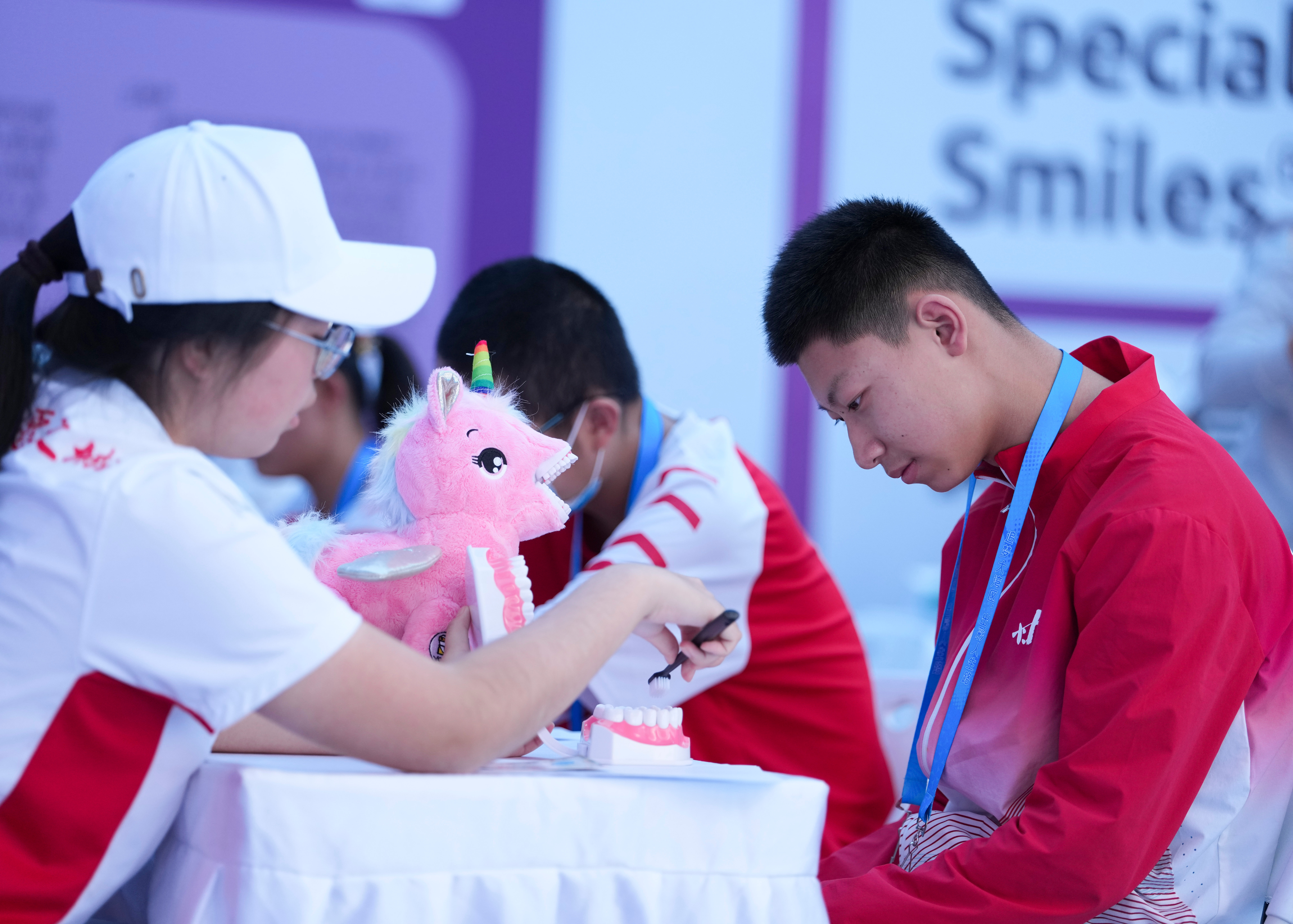 12月8日,在广东省中山市体育馆副馆,工作人员为特奥运动员普及护齿知识。新华社记者杨晨光摄