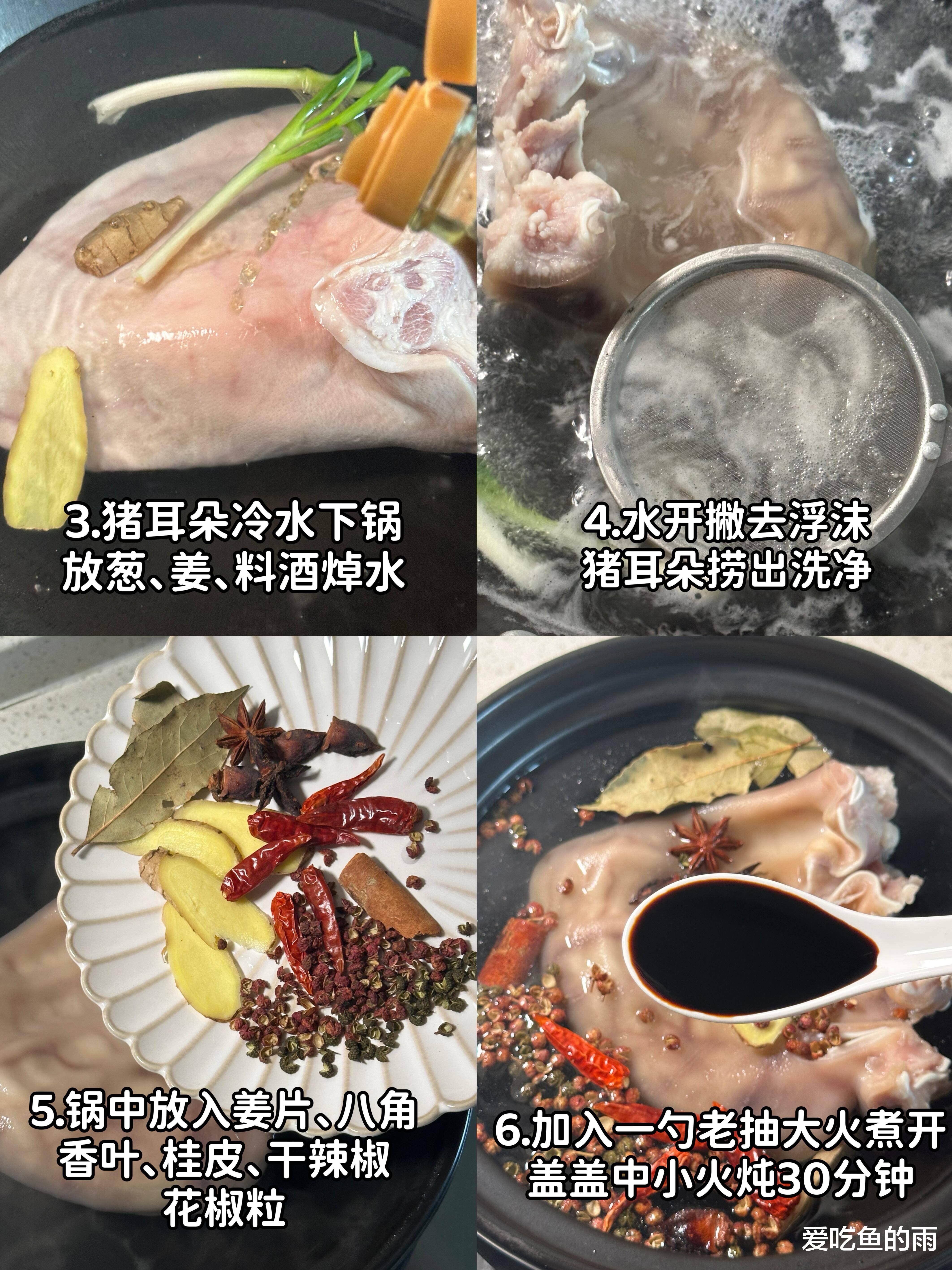凉拌猪耳朵的魅力,在于“脆”与“鲜”的完美碰撞。制作它,需耐心与巧思。首先,选料要精:新鲜猪耳,毛净皮薄,肉质紧实,卤制后才能脆而不硬。焯水去腥后,入锅慢卤。锅中放八角、桂皮、香叶、花椒,再添几片姜、几段葱,倒入老抽生抽,撒一把冰糖。大火煮开,小火慢炖,直到筷子能轻轻扎透,关火焖半小时,让味道渗进每一丝肉里。卤好的猪耳,切成薄片,要薄如蝉翼,却不断不碎——这考验刀工,更考验对食材的理解。