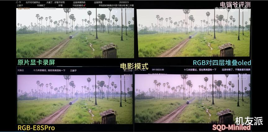 看博主的实测画面就很清楚了,在电影模式下,海信E8S Pro色彩表现非常细腻,草地的深浅变化很自然,画面纯净度比SQD-Mini LED更高,甚至达到了能和旗舰OLED媲美的水平。