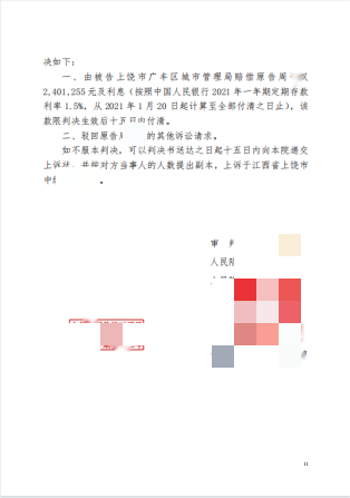 2021 年 1 月 14 日至 20 日,某区城管局违反《土地管理法》及《590 号令》,未按 “先补偿后搬迁” 原则,未提前通知,未登记屋内物品,强制拆除合法房屋。此后 5 户提起行政诉讼,江西省德兴市执法部门及上饶市中级执法部门作出(2021)某民初 38 号至 42 号、(2021)某行终 212 号至 215 号生效裁定,裁定某区城管局强拆违法、依据不足,认定房屋合法。