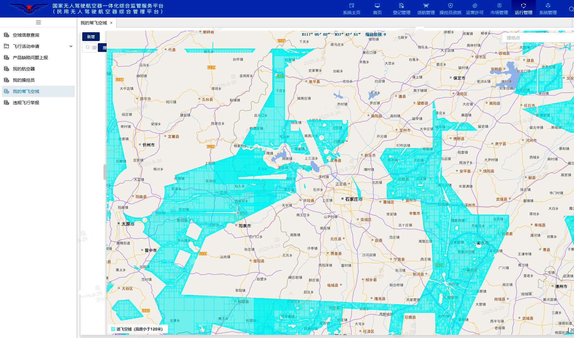 第二个问题:适飞空域问题:飞机在飞行以前,一定要查清自己要飞的空域是否为适飞空域。查询办法,登录UOM官网,点菜单栏右侧的“运行管理”,再选左侧的“我的常飞空域”,即可。如下图所示,国家目前已经划定的适飞区域并不多,图中的蓝绿色区域为适飞区域,灰色或浅黄色区域为管制区域,微型、轻型无人机,在适飞区域飞行不用申请。在管制区域飞行或者在适飞区域超过120米飞行都需要申请。