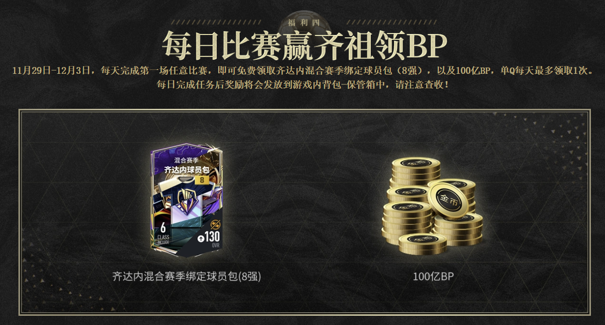11月29日10:00-12月4日0:00期间,玩家登陆游戏就能免费领取【齐祖回旋赠礼】、【一代宗师转移福利包】,感受核心中场的极致优雅。