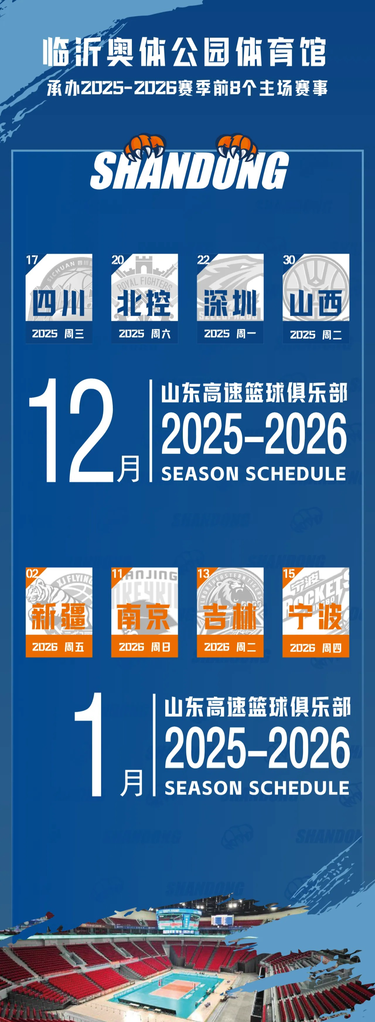 山东高速男篮25—26赛季主场组合:山东济南高速体育馆 + 临沂奥体中心,具体驻场时间见上方截图。前八场比赛在临沂奥体中心,后面的主场回到济南,这跟去年的安排一模一样。另外,山东蜜獾的主场也放在了高速体育馆,后期比赛如果有冲突,蜜獾会移师山东大学体育馆。