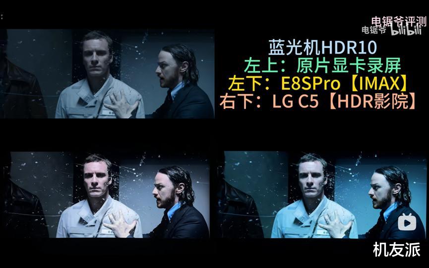 就拿上面这组对比效果来说,在播放HDR影片时,海信E8S Pro的色温更接近原片,亮度上也更占优势,而代表OLED出战的LG C5整体色调偏蓝,画面质感上有些失真。