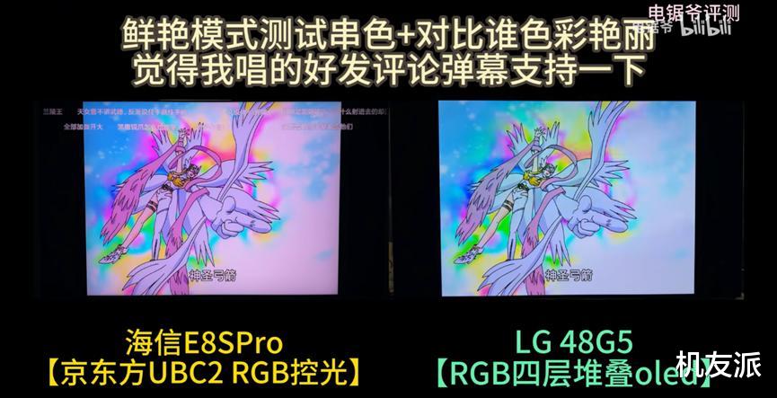 还有这段鲜艳模式下测试《数码宝贝》的片段,可以很明显看出海信E8S Pro的色域覆盖面积更广,色彩过渡更加细腻,围绕在天女兽身边的气泡和祥云可以呈现出更丰富的颜色,并且过渡柔和自然无断层,视觉效果上比LG 48G5更有冲击力。