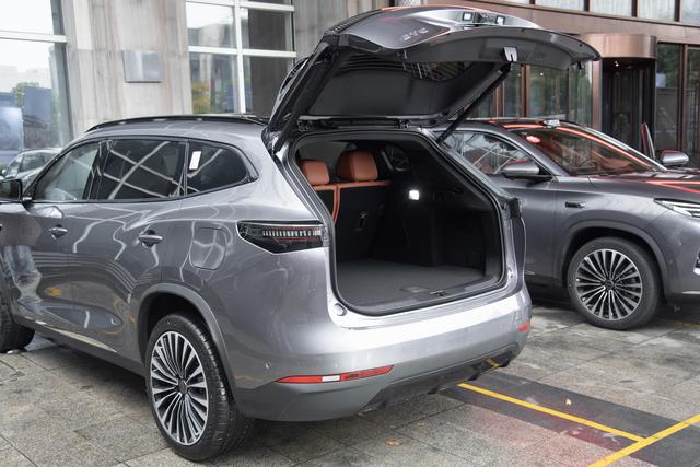 19英寸多幅轮毂与车身搭配协调,风格中性,不会过于运动也不显老气,搭配235/55 R19轮胎,过减速带时滤震效果不错。我试驾的暮光紫车身颜色很有特色,阳光下偏紫,阴天则呈深色调,不易显脏,比白色更具辨识度,比黑色更为灵动。车身细节兼顾实用与美观,车顶激光雷达设计小巧,不会突兀凸起,既降低风阻又保持整体协调性;尾门的小翘臀设计,不仅提升颜值,还能增加高速行驶时的下压力,增强行驶稳定性。