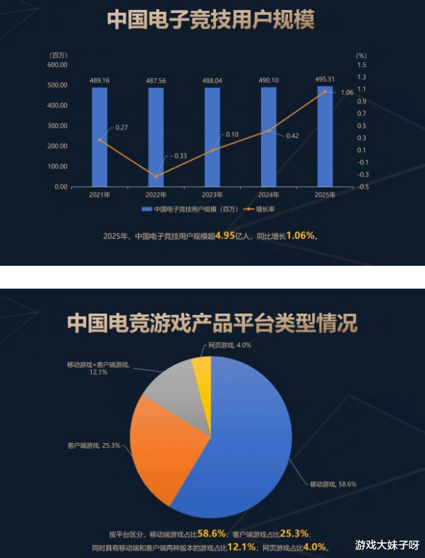 相比之下,赛事与俱乐部收入仅占15.03%,这反映出产业链收益结构依然高度依赖“流量入口”端,而赛事运营、俱乐部经营仍处于探索完善阶段。换言之,中国电竞企业真正的商业价值转化模式仍有待拓展,从多个角度看,未来电竞产业必然面临从“主播依赖”向“内容运营生态”转型的压力,电竞用户规模方面,2025年用户数量超4.95亿,同比增长1.06%,虽然增长幅度不算显著,但值得关注的一点是:在这样接近饱和的市场背景下,行业整体仍能保持增长,这说明电竞不是昙花一现,而是深度融入年轻人生活方式的一部分。