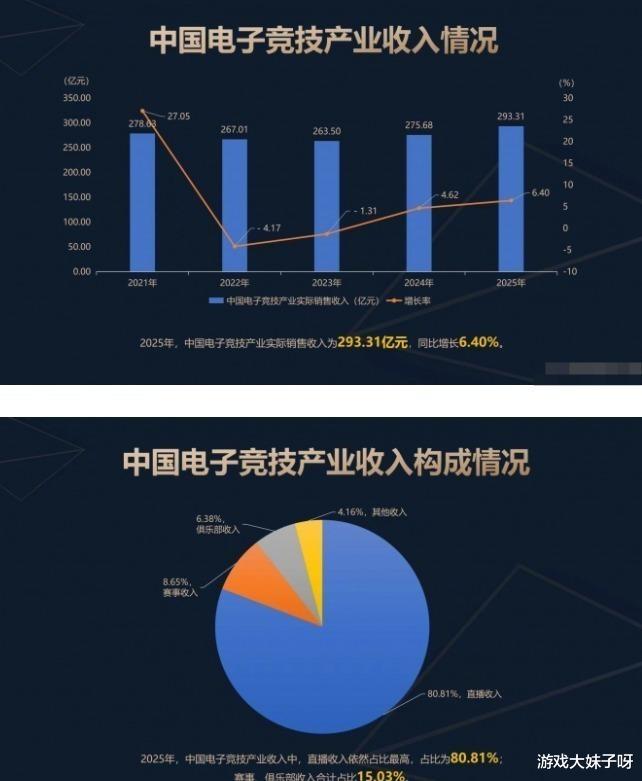 最核心的数据莫过于产业收入规模——2025年中国电竞产业实际销售收入达到293.31亿元,同比增长6.40%,这一增长并不算爆发式,但在宏观经济环境趋于谨慎的大背景下,这一增幅体现了电竞行业体量巨大且具备抗风险能力的特征。其中直播收入依然占据主导地位,占比80.81%,意味着电竞仍然是互联网直播领域的核心内容之一,也显示出用户观看电竞赛事、陪伴主播内容的需求依旧旺盛。