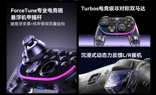 ABXY按键采用耐用导电胶,寿命同样达到 500万次,按感清晰、不松垮。肩键和十字键使用轻触开关,回弹明确,连发操作干脆。功能方面,支持六轴体感、RGB灯效、宏定义,附带智能充电底座与管理软件,可对灯效、摇杆灵敏度、按键映射等进行深度定制。
