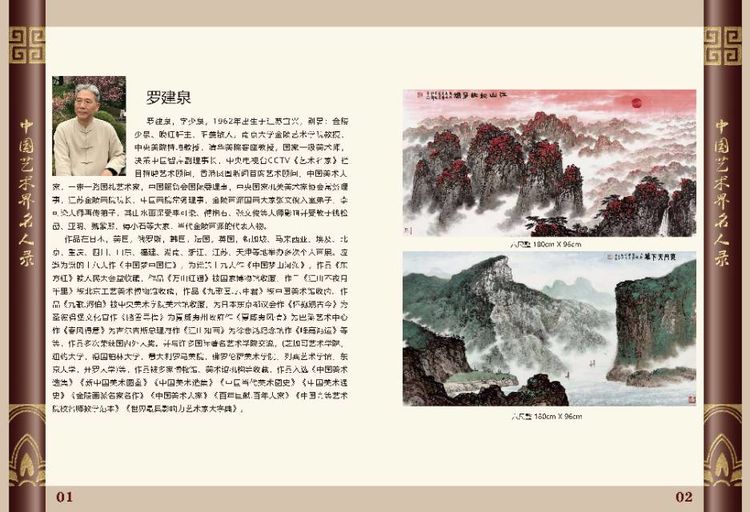 罗建泉,字少泉,1962年出生于江苏宜兴,别署:金陵少泉、晚红轩主、阳羡散人。南京大学金陵艺术学院教授,中央美院特聘教授,清华美院客座教授,国家一级美术师,决策中国智库副理事长,中央电视台CCTV《艺术名家》栏目特聘艺术顾问,香港凤凰新闻首席艺术顾问,中国美术大家,一带一路国礼艺术家,中国服贸会国际委理事,中央国家机关美术家协会常务理事,江苏金陵画院院长,中国画院常务理事,金陵画派国画大家张文俊入室弟子,李可染大师再传弟子,其山水画深受李可染、傅抱石、张文俊等大师影响并受教于钱松嵒、亚明、魏紫熙,傅小石等大家,当代金陵画派的代表人物。作品在日本,美国,俄罗斯,韩国,法国,英国,新加坡、马来西亚、埃及、北京,重庆、四川、山东、福建、湖南、浙江、江苏、天津等地举办多次个人画展。应邀为党的十八大作《中国梦中国红》,为党的十九大作《中国梦山河颂》,作品《东方红》被人民大会堂收藏,作品《万山红遍》被国家博物馆收藏,作品《江山不夜月千里》被北京工艺美术博物馆收藏,作品《九歌图.云中君》被中国美术馆收藏。作品《九歌.河伯》被中央美术学院美术馆收藏,为日本东京都议会作《怀抱观古今》为圣彼得堡文化宫作《踏雪寻梅》为夏威夷州政府作《夏威夷风情》为巴黎艺术中心作《春风得意》为吉尔吉斯总理府作《江山如画》为徐悲鸿纪念馆作《峰高鸿运》等等。作品多次荣获国内外大奖。并与许多国际著名艺术学院交流,(芝加哥艺术学院,纽约大学,德国柏林大学,意大利罗马美院,佛罗伦萨美术学院,列宾艺术学馆,东京大学,开罗大学)等。作品被多家博物馆、美术馆机构等收藏。作品入选《中国美术选集》《新中国美术图鉴》《中国美术选集》《中国当代美术图史》《中国美术通史》《金陵画派名家名作》《中国美术大家》《百年巨献.百年大家》《中国⾼等艺术院校名师教学范本》《世界最具影响力艺术家大字典》。