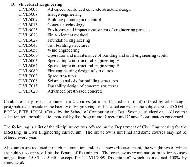 学生需成功完成72个学分才能毕业。学生必须成功完成不少于36个学分的土木工程学科课程、另外12个学分的选修课程以及一篇相当于24学分的论文。