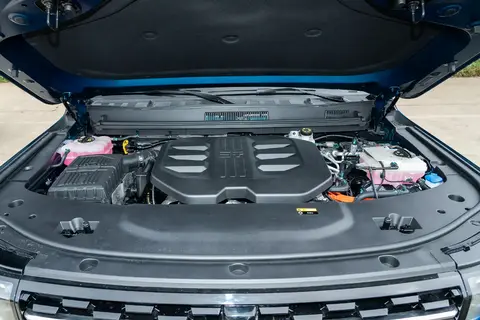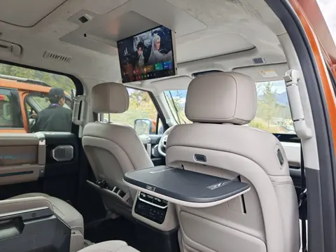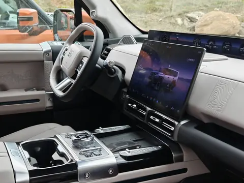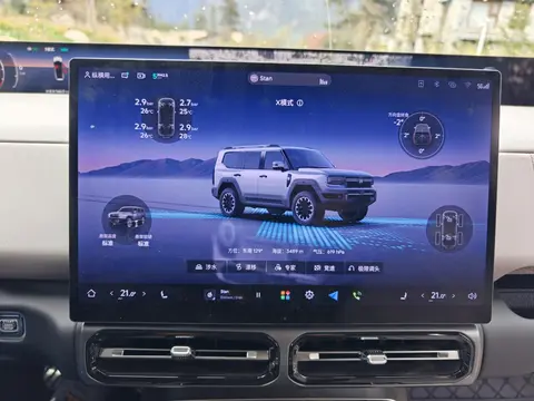 内饰方面:内饰部分也带来了更多的新意,35.4英寸天际线远端屏加15.6英寸中控屏的组合科技感拉满,远端屏显示导航信息不用低头看中控,后排17.3英寸吸顶屏更是带娃神器,投屏动画片后孩子全程不吵闹。贯穿式屏幕主要显示行车信息,除了传统仪表盘的功能外,还拥有虚拟的越野仪表等数据。此外内饰的氛围也向豪华靠拢,细节上应用了金属感的材质进行搭配,并覆盖大量软性材料与皮革,触感和观感都同时照顾到。
