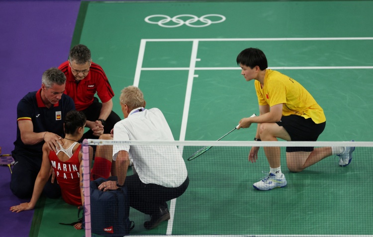 巴黎奥运羽毛球女子单打半决赛,中国选手何冰娇对阵西班牙选手马林。比赛第二局马林膝盖受伤倒地, 何冰娇晋级羽毛球女单决赛。
