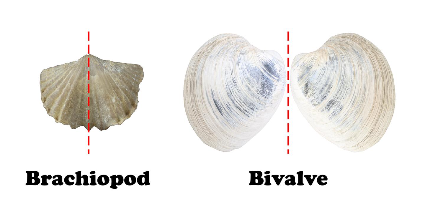 △ 腕足类和双壳类不同之一是它们壳,腕足类单壳左右对称,而双壳动物是两个壳彼此对称,但单壳不对称。
