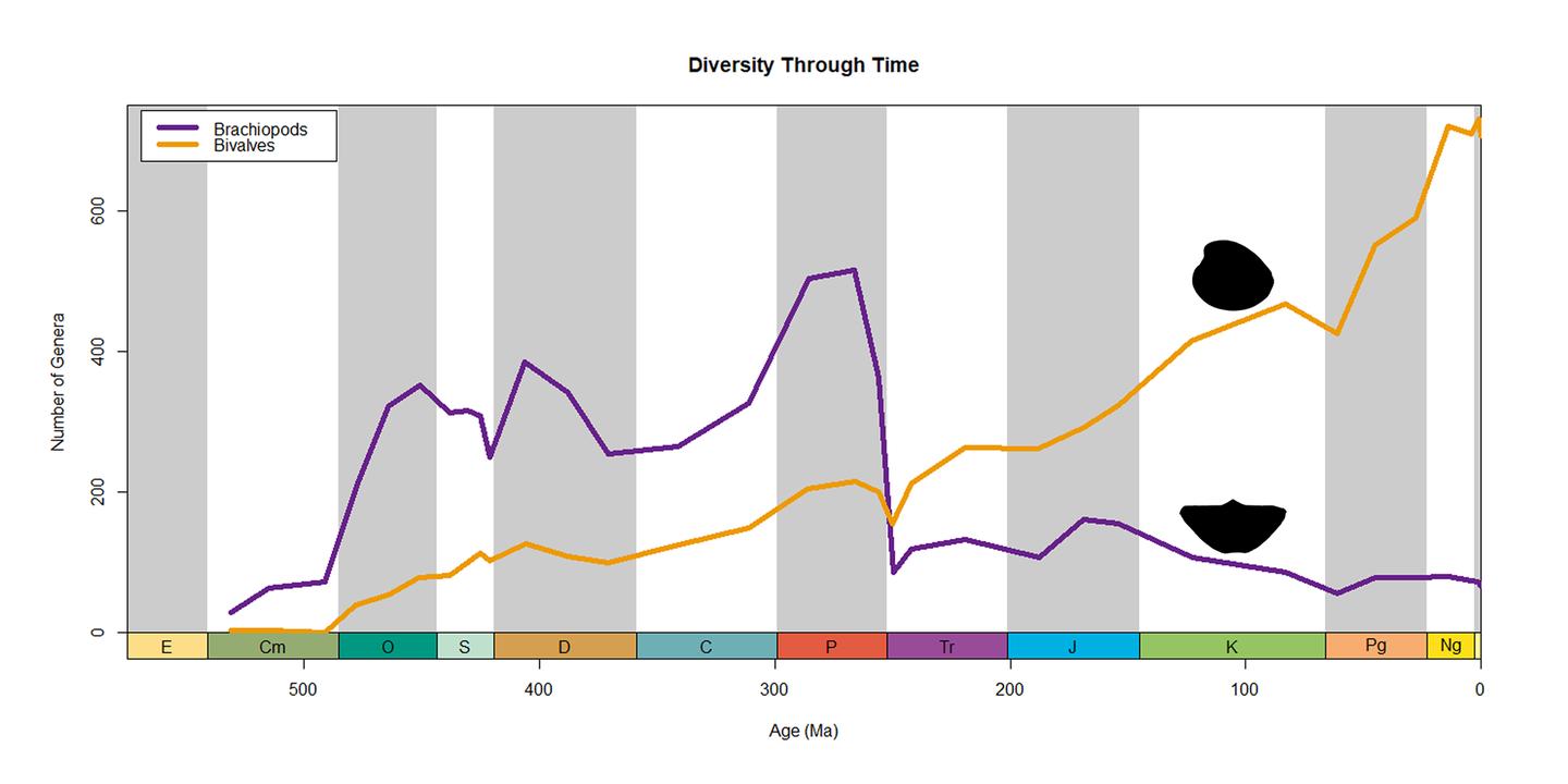 注意到紫色线条(腕足动物)断崖走低了吗,那就是二叠纪末大灭绝(约2.5亿年前)导致的,而在此之前,腕足动物的多样性增长情况和双壳动物是差不多的,只有大灭绝之后,多样性才是一方增长,另一方下降。