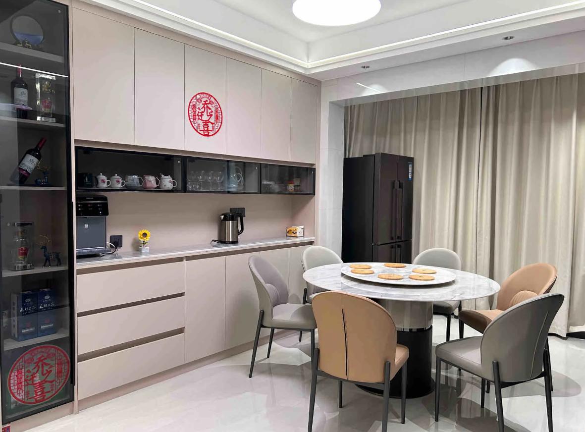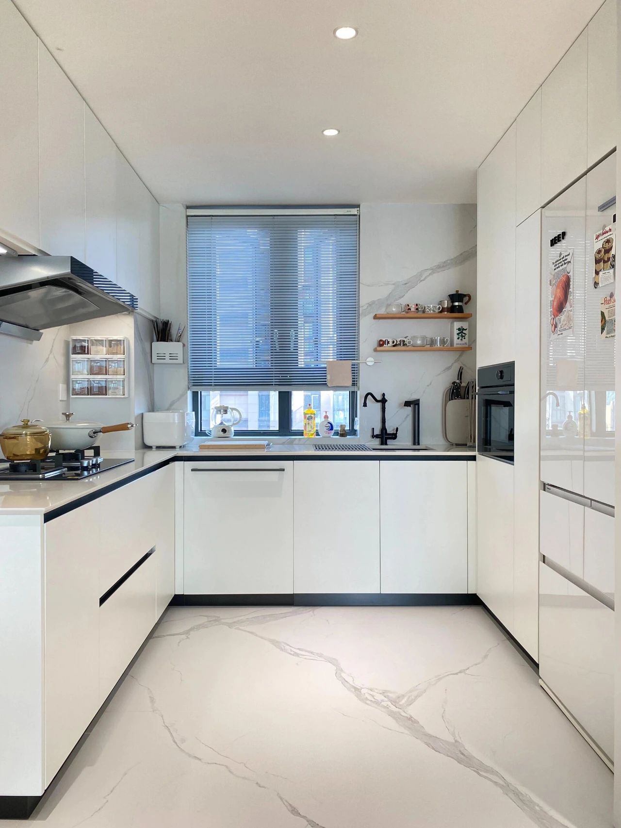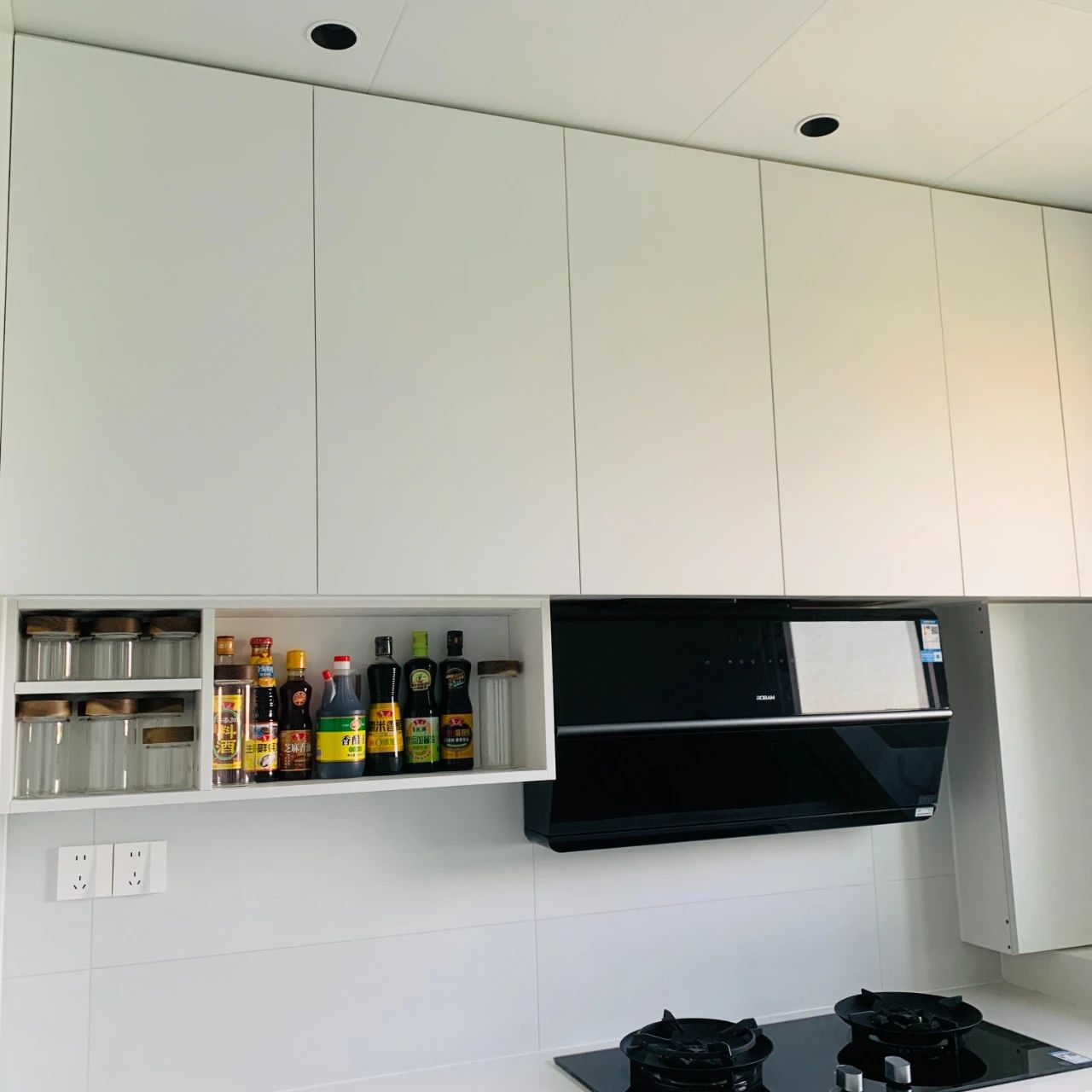 4)若厨房小家电较多,并且使用频率较高,一定要做一组高柜,并给开放格隔层做抽拉设计。反之,就安装上柜门。