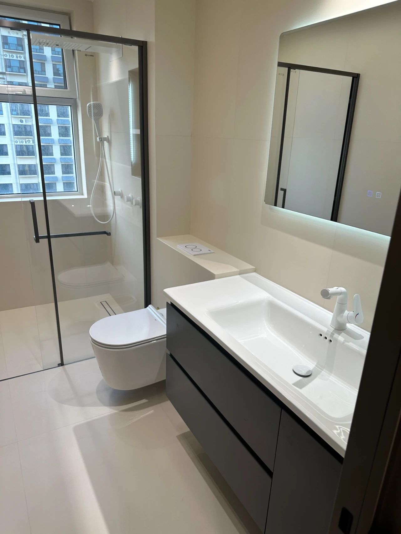 不过若和马桶挨在一起的话,可以在柜体侧面做2~3层开放格设计,方便纸巾、手机、香薰等物品的收纳。