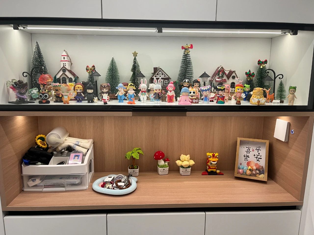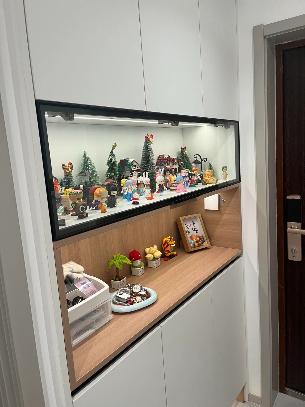 此外,鞋柜中间位置也可以做双层开放格设计,一层随手置物,一层安装上掀玻璃门,专门收纳一些手办,提升玄关区的仪式感。