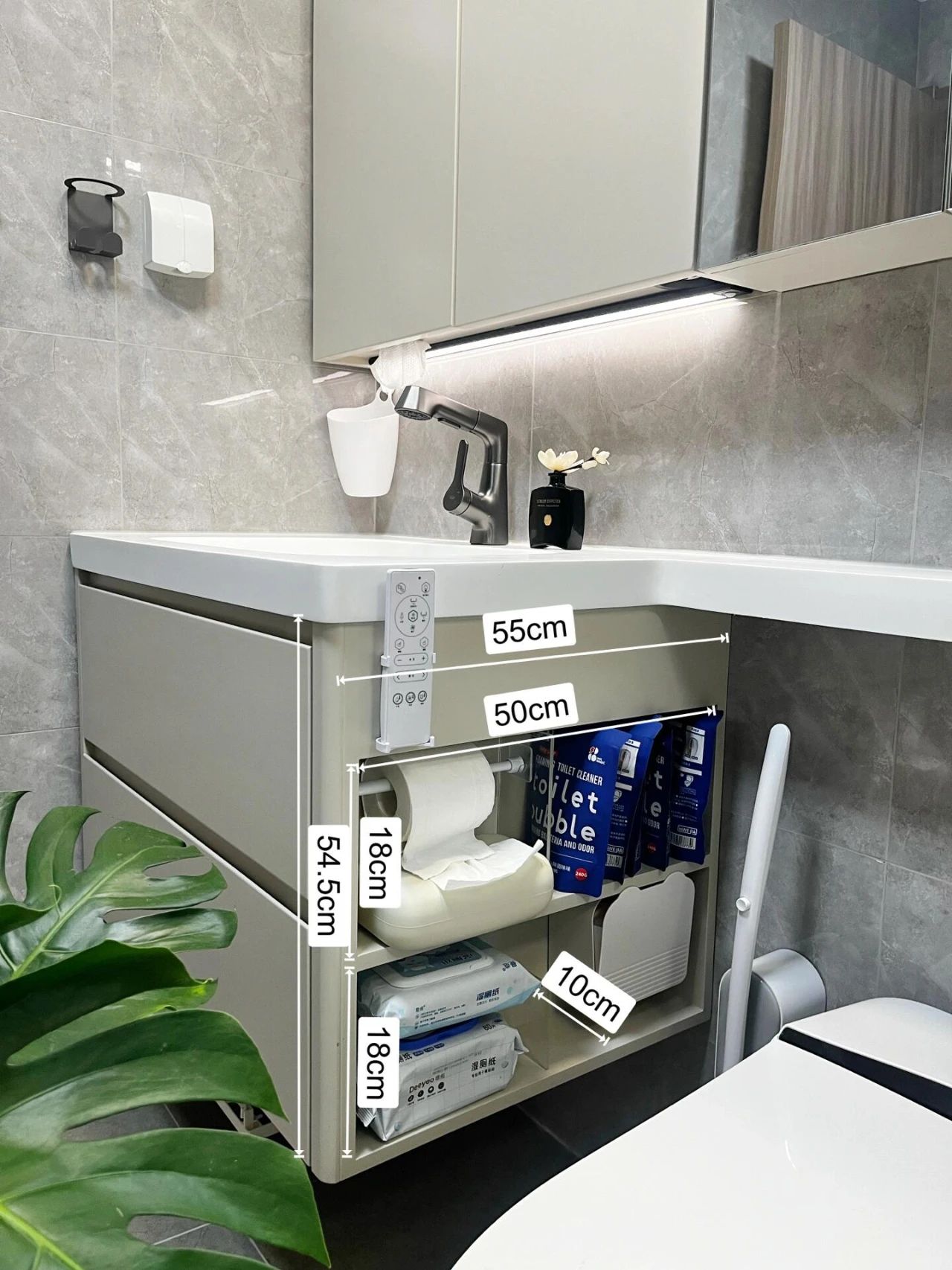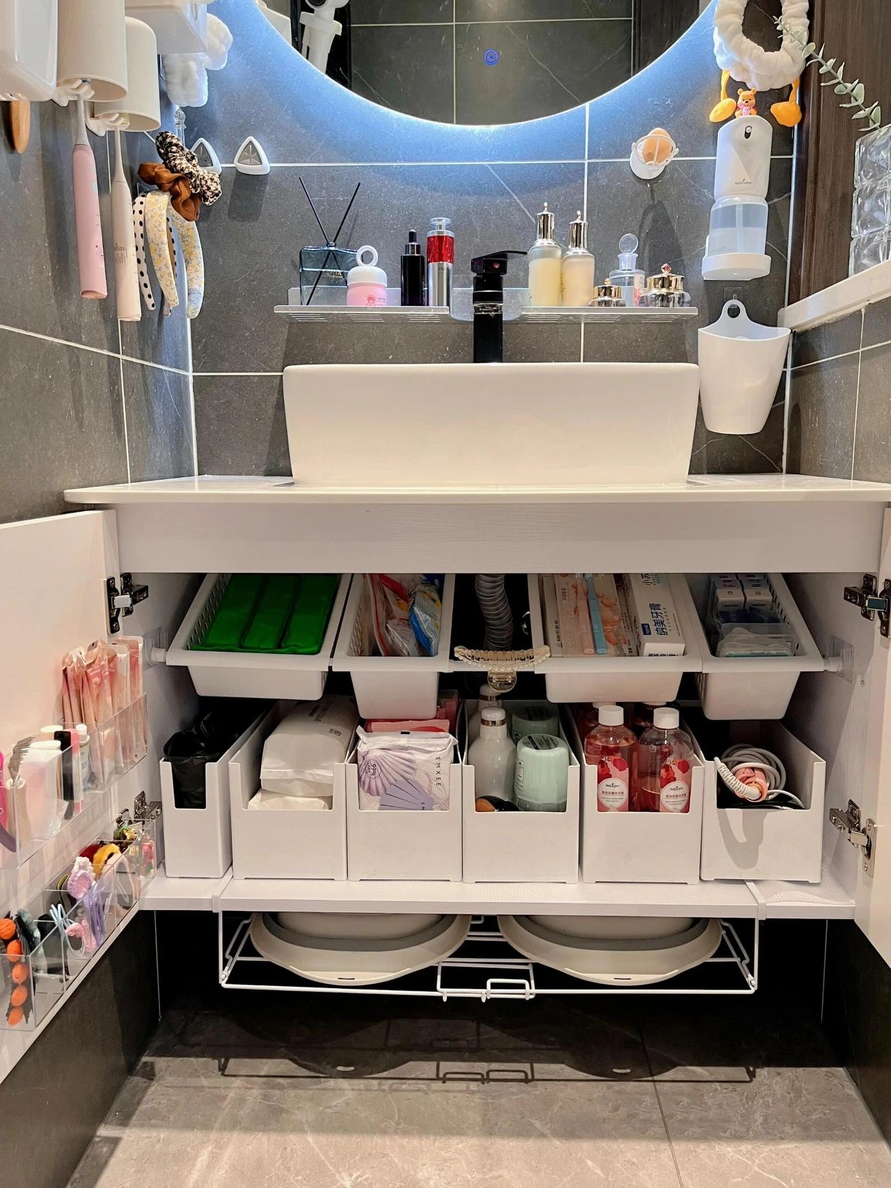 除此之外,浴室柜的底部镂空区,我们也可以借助置物工具,做进一步收纳,不浪费每一寸空间。