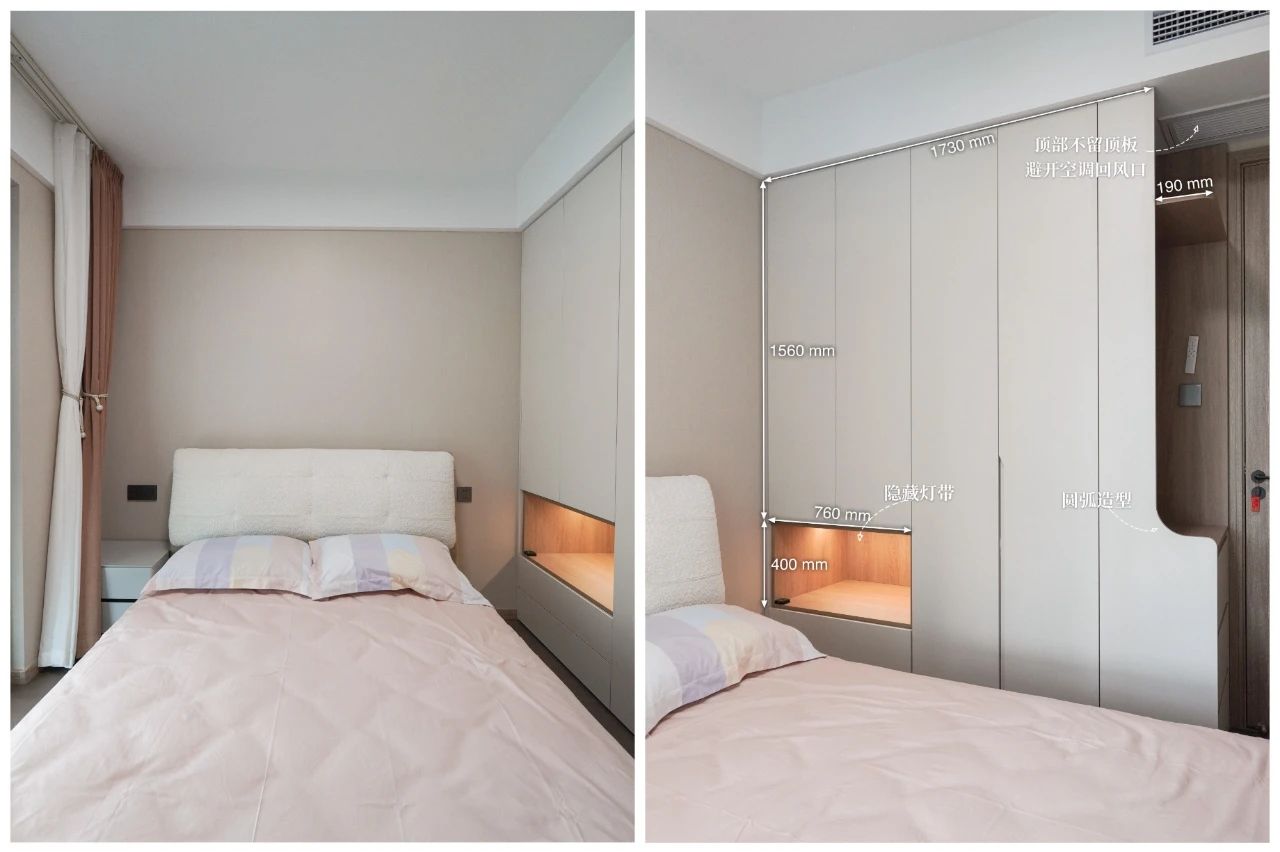 相较于常规做法,这种设计巧妙规避了柜体过深拿取不便,以及空间容易过剩的问题。