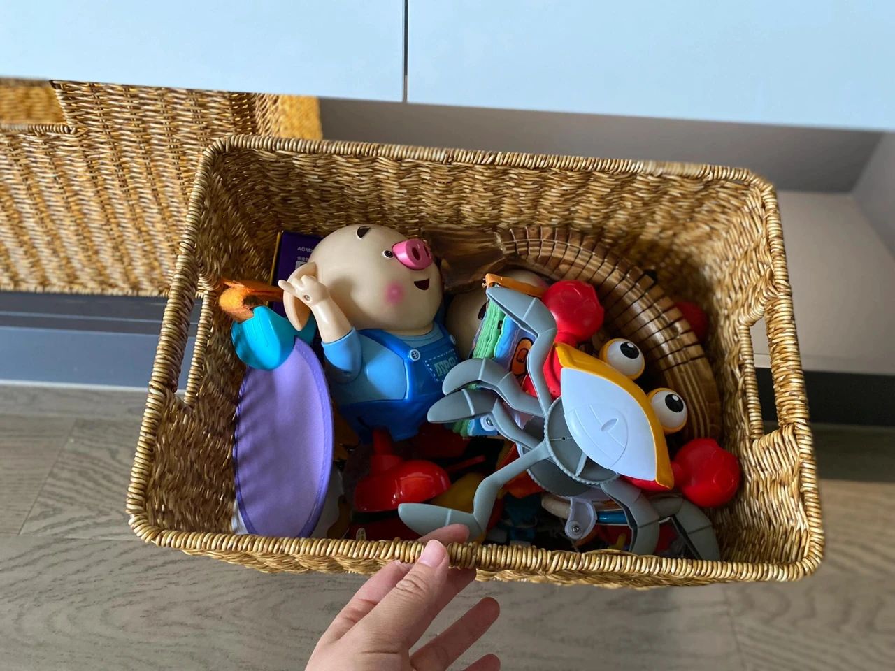 所以,我们可以给满墙柜底部做个地台+开放格设计,然后再搭配上收纳筐,一个移动收纳区就有了,在便于培养孩子自主收纳习惯的同时,也不会影响到空间的整体性。