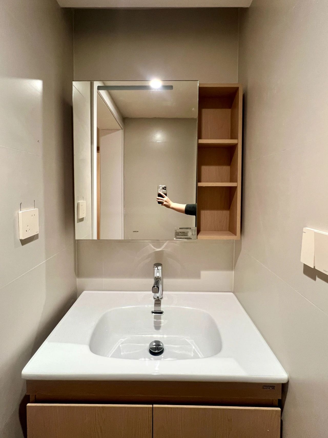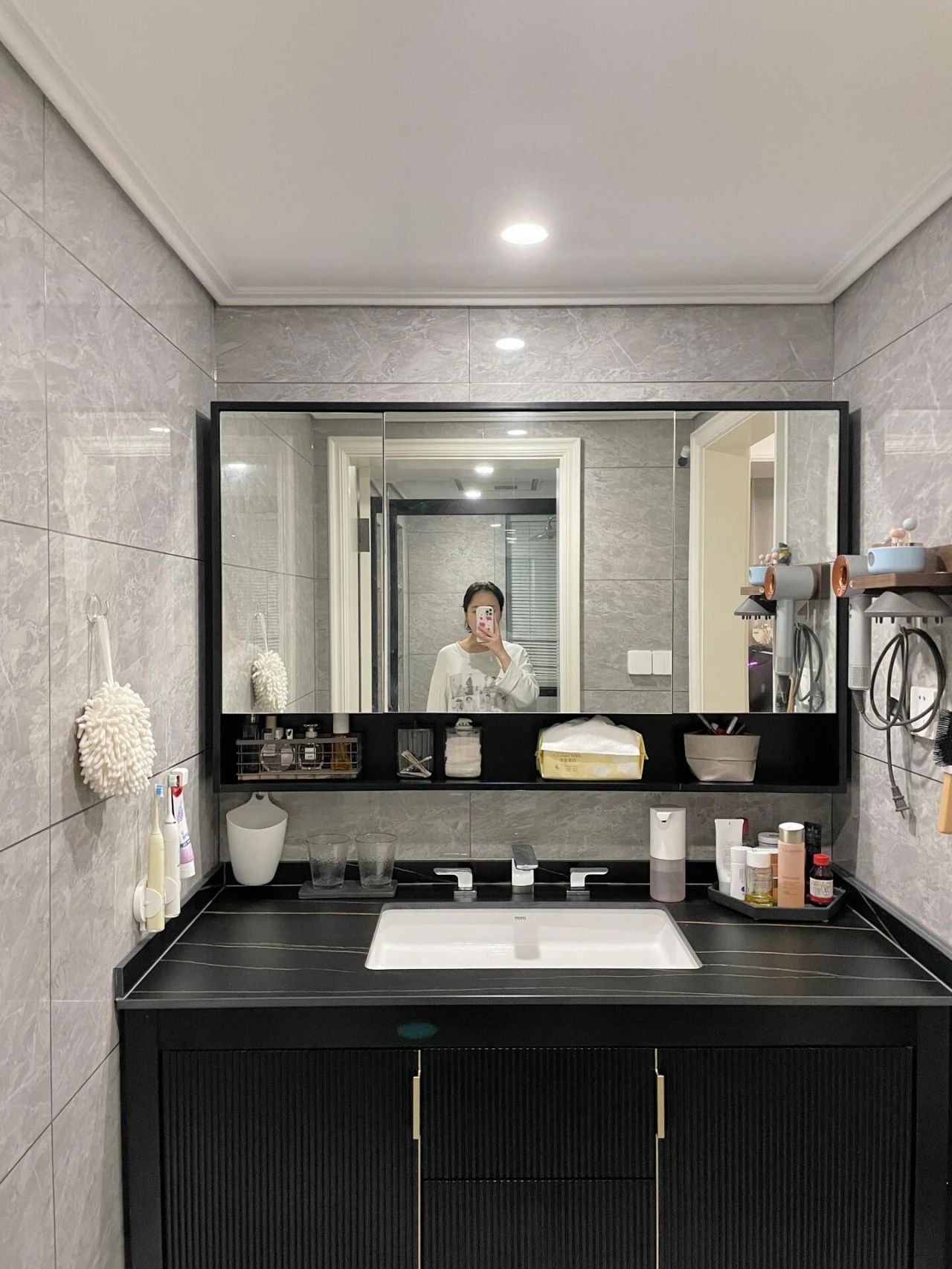 其实,我更倾向将开放格设计在镜柜下方,一是使用时更加方便,二是视觉比例会更加协调,并且不会压缩镜子面积。