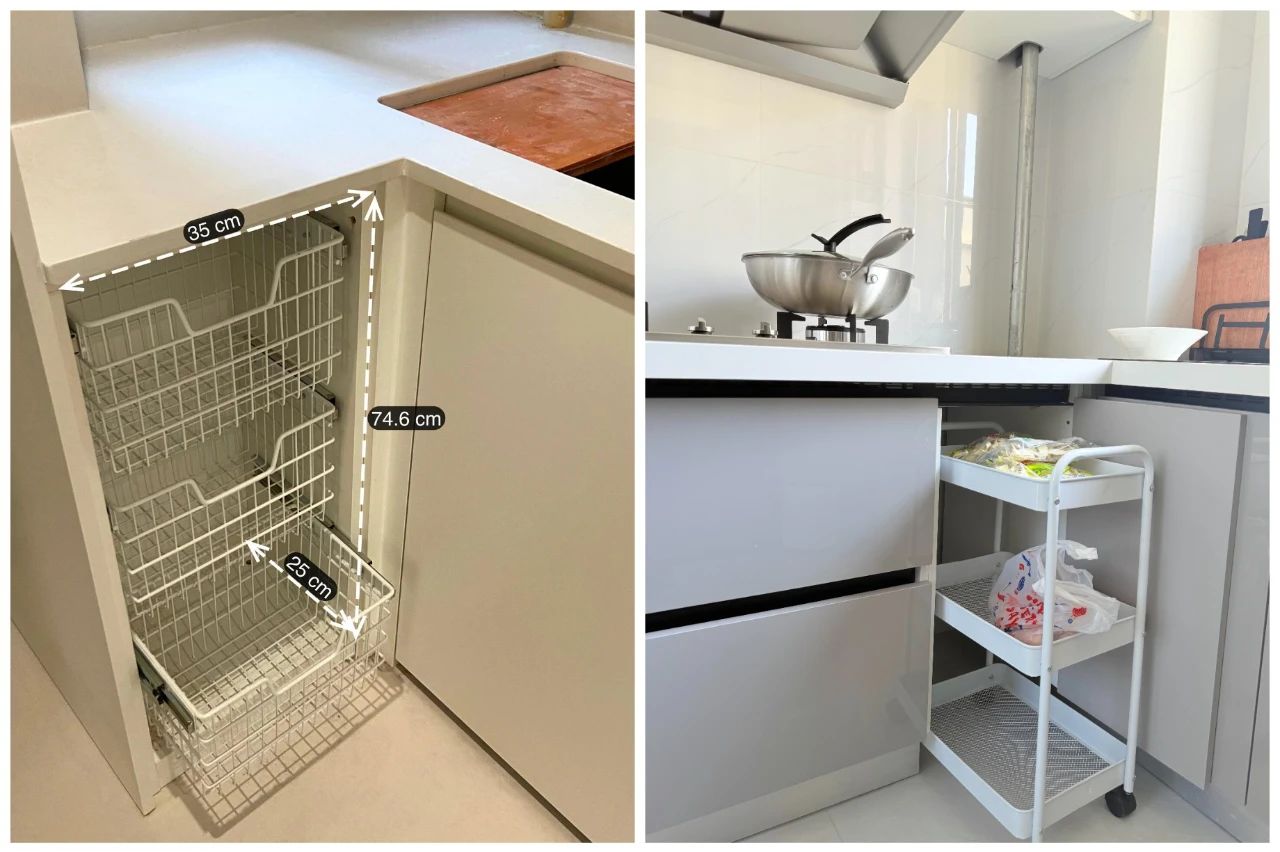 1)定制橱柜时可以留一块开放格,不管是安装拉篮,还是放个移动小推车都可以,方便收纳一些不适合放冰箱的蔬菜。