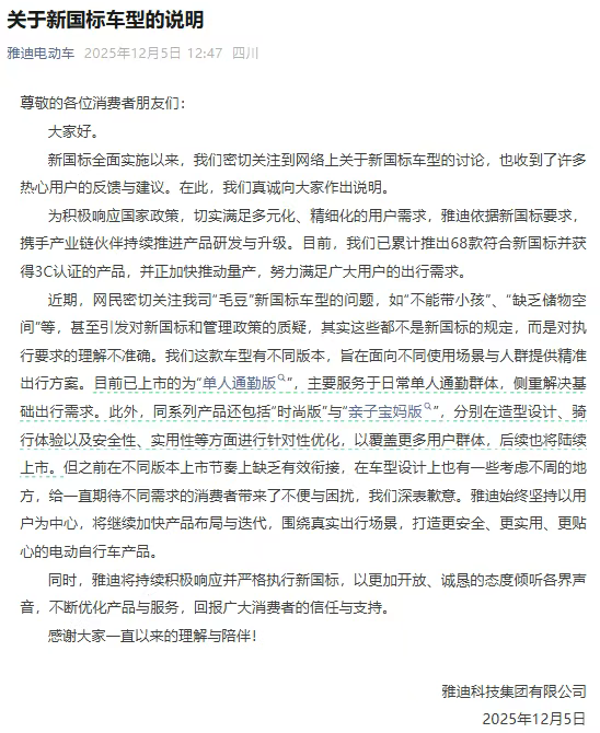 12月以来,雅迪“毛豆”电动车(“单人通勤版”)因“不能带小孩”“缺乏储物空间”等问题引发热议。12月5日,雅迪科技集团正式发布声明致歉,承认产品设计与上市节奏存在疏漏,相关争议车型已在线上旗舰店暂时下架。
