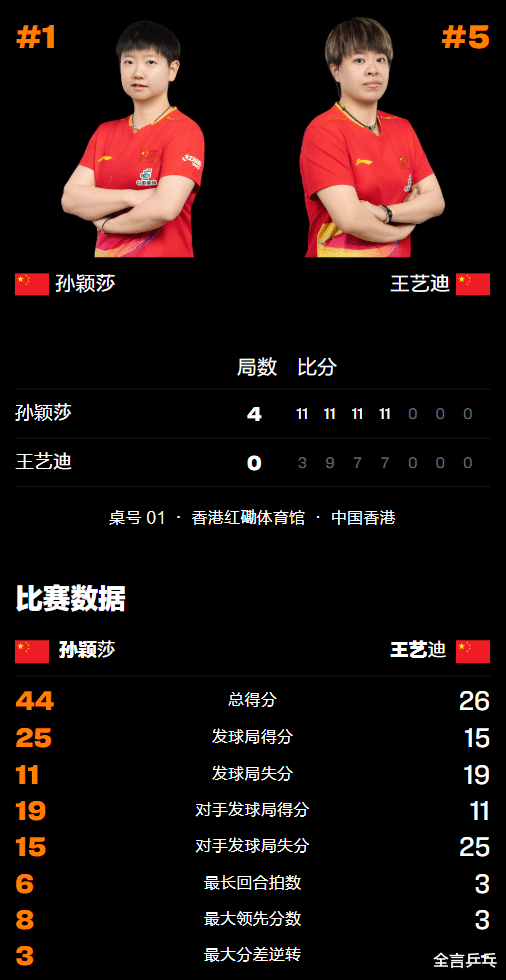 北京时间2025年12月11日晚,乒乓球WTT香港总决赛结束女单首轮的最后一场较量,国乒两大主力孙颖莎、王艺迪狭路相逢爆发内战,结果孙颖莎以较大优势4-0取得胜利,女单8强也由此而全部诞生,国乒5人晋级2人输内战被淘汰,日本2人韩国1人过关——孙颖莎VS王艺迪战况与其他女单首轮比赛详情请看下文。