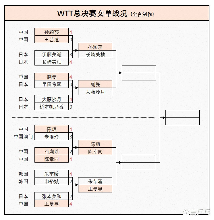1/4区:孙颖莎(中国)4-0王艺迪(中国)、长崎美柚(日本)4-3伊藤美诚(日本);