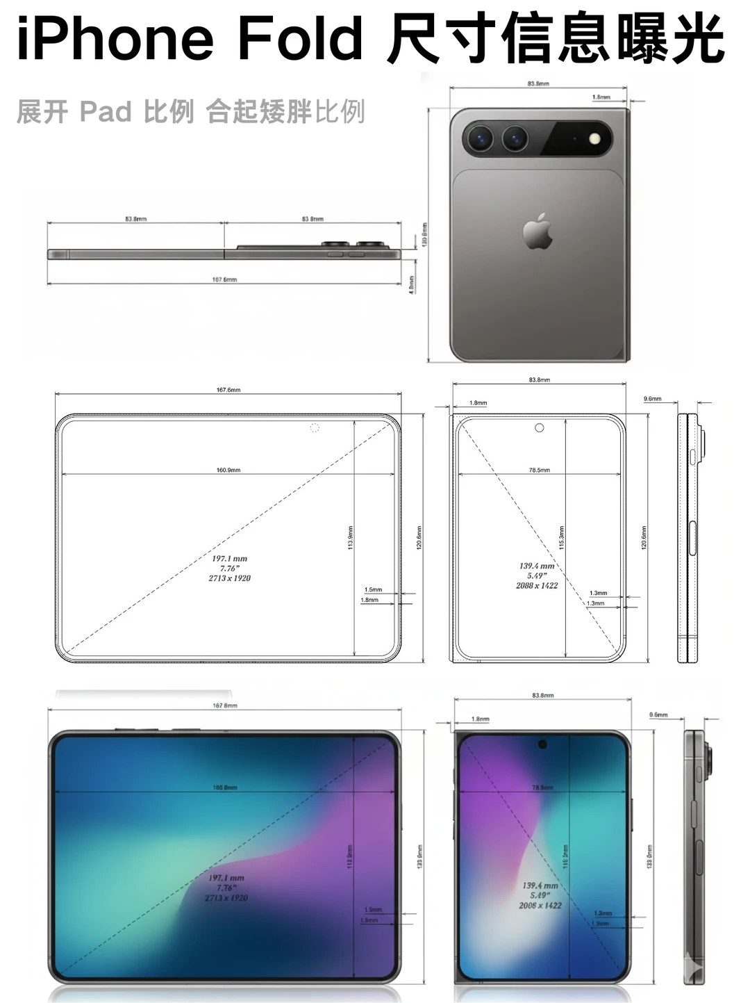 1.iPhone折叠屏将延续传统大折叠横向展开的形式,但整体是偏“宽”的比例。2.屏幕尺寸:内屏约7.7英寸、外屏约5.3英寸;而更早也出现过7.8/5.5英寸的这组尺寸——或许还未完全定版,但整体尺寸偏小。