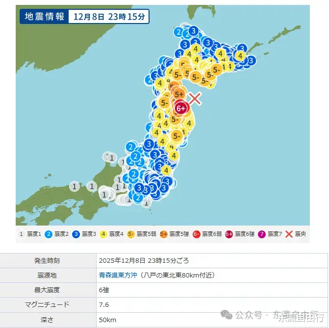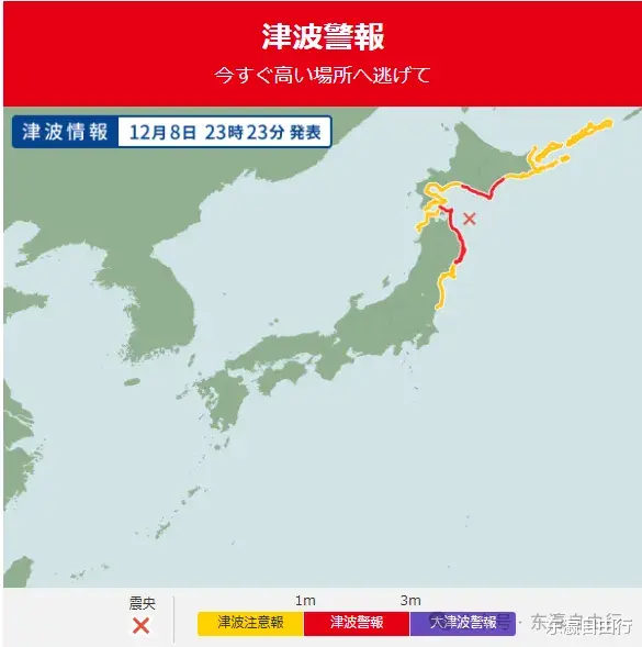 据日本气象厅消息称,8日23点15分,青森县东方冲地域发生震度6级强(震级7.6级)地震。震源深度约为50km,可能会引发海啸。气象厅同时对青森太平洋沿岸、岩手县、北海道太平洋中部地区发布了海啸警报。呼吁当地住民或游客前往高地避险。