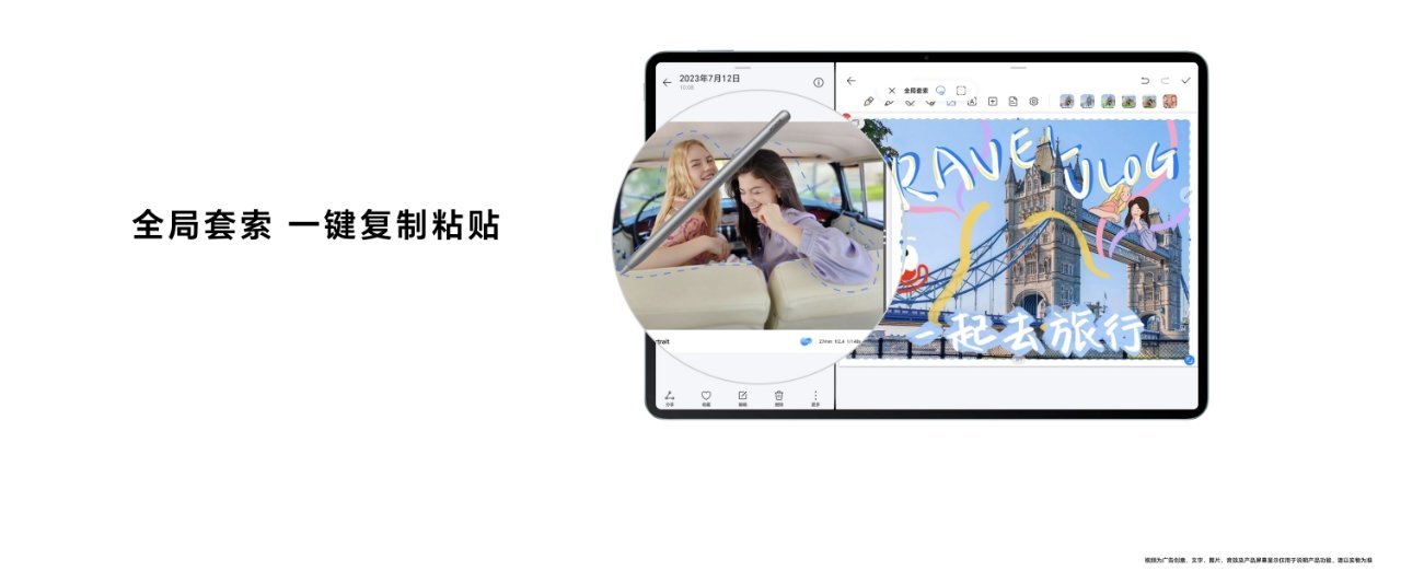 荣耀平板MagicPad 13推出的跨应用取色功能,能够直接通过多屏协同下跨应用取色,将喜欢的颜色应用在荣耀笔记中进行创作;全局套索功能,支持将图片、文件以及网络页面中选定的人像、景观、建筑物等一键复制粘贴;