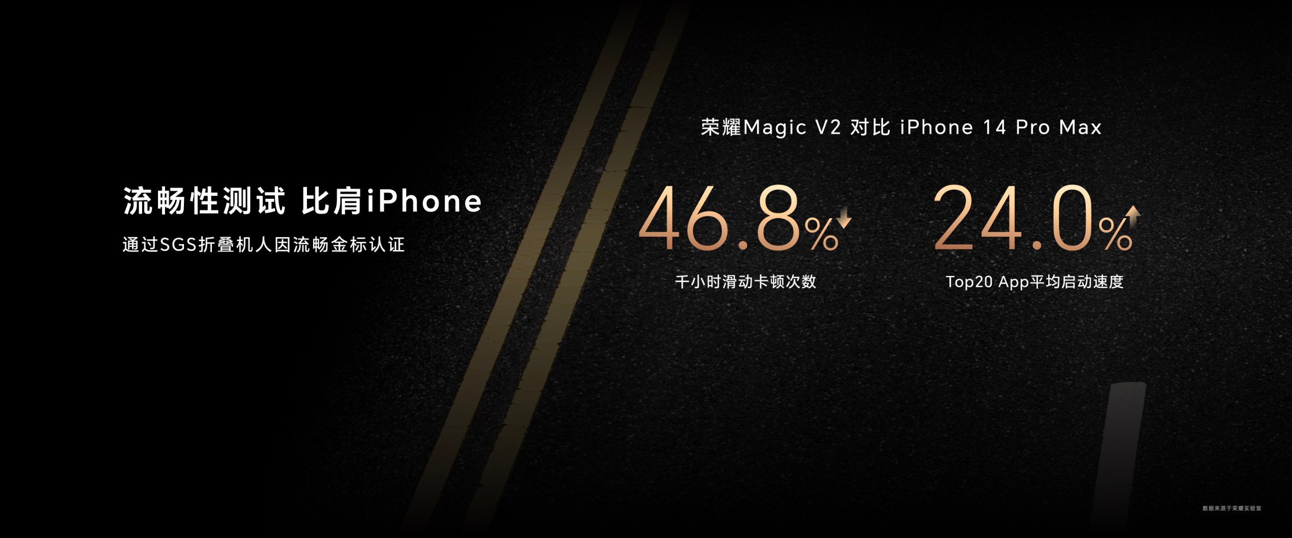 #荣耀MagicV2#首发第二代骁龙 8 领先版,在MagicOS加持下, 应用内滑动、连续启动的流畅性体验做到了超越 iOS,是首款获得SGS 50个月持久流畅金标认证的手机。荣耀 Magic V2 全系搭载自研射频增强芯片,在各种弱网环境中,对比iPhone 14 Pro Max都有更好表现。MagicOS 拥有创新的荣耀平行空间,结合大屏优势可实现分屏就像两台手机的便捷体验;在安全方面,荣耀Magic V2 是行业唯一支持两锁一芯和隐私通话的折叠手机。
