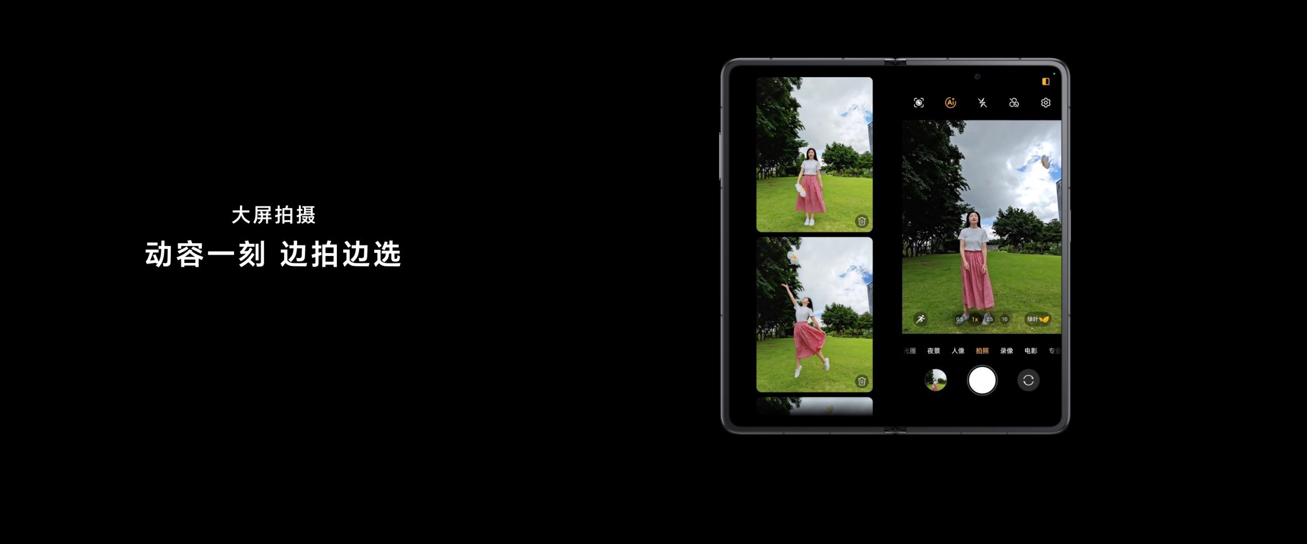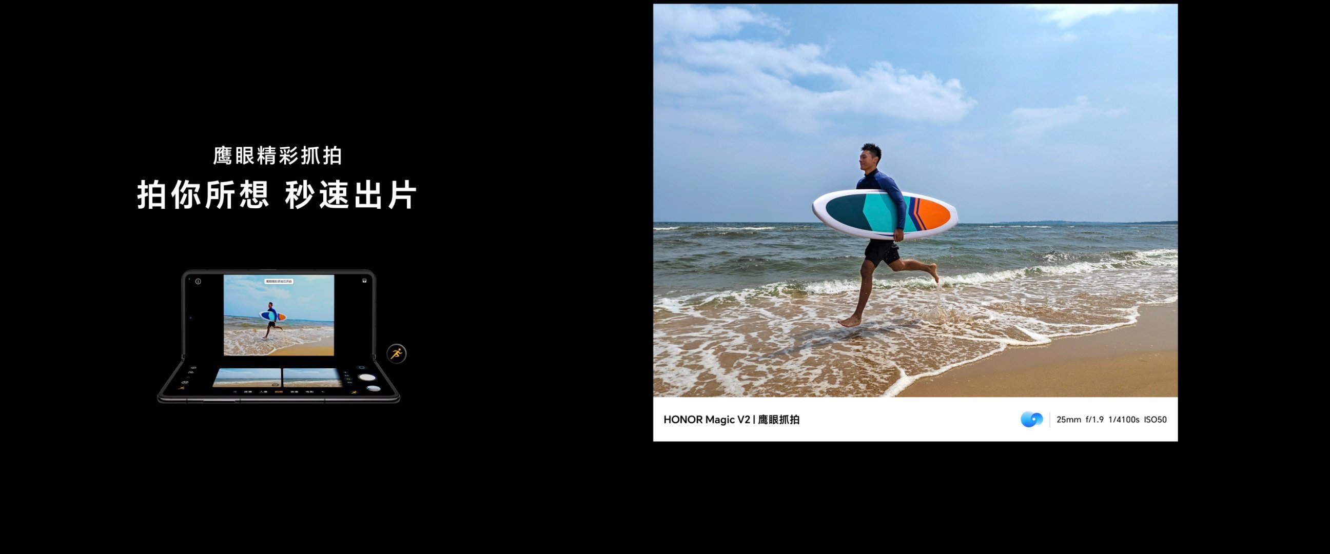#荣耀 MagicV2#搭载 5000 万像素广角和超广角镜头,2000 万像素长焦镜头,主摄和长焦镜头均支持光学防抖,同时最多支持 40X 变焦,满足各个焦段的拍摄需求;在快速运动场景中,荣耀精彩鹰眼抓拍迅速,不仅高清且细节满满,结合悬停功能,一个人也可以拍摄精彩瞬间。此外,利用大屏的分屏优势,荣耀Magic V2还可以实现边拍边选的体验。