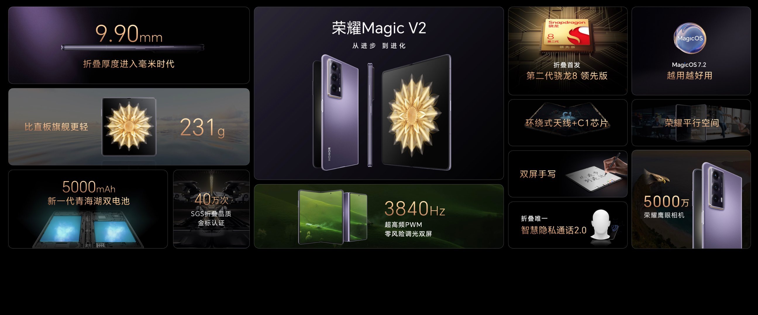 荣耀Magic V2搭载荣耀鹰眼相机,实现最强折叠影像配置。