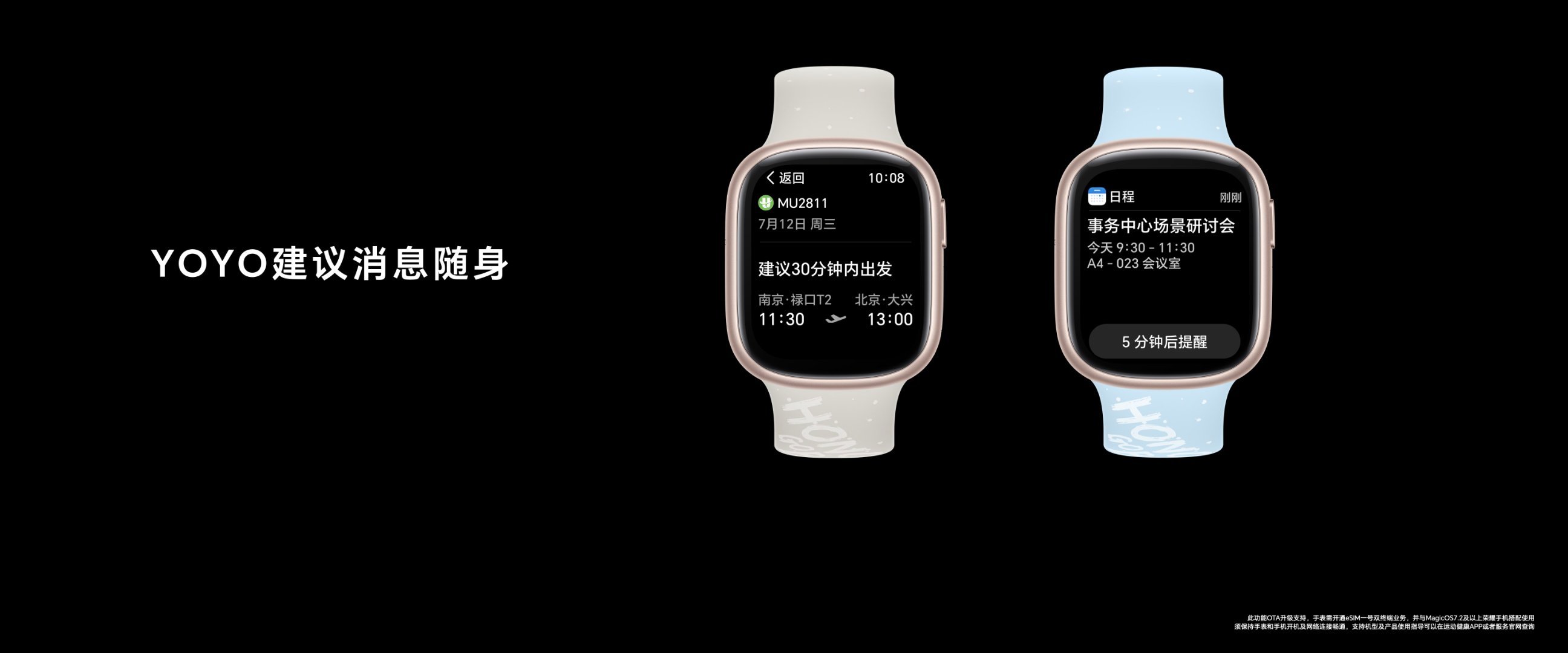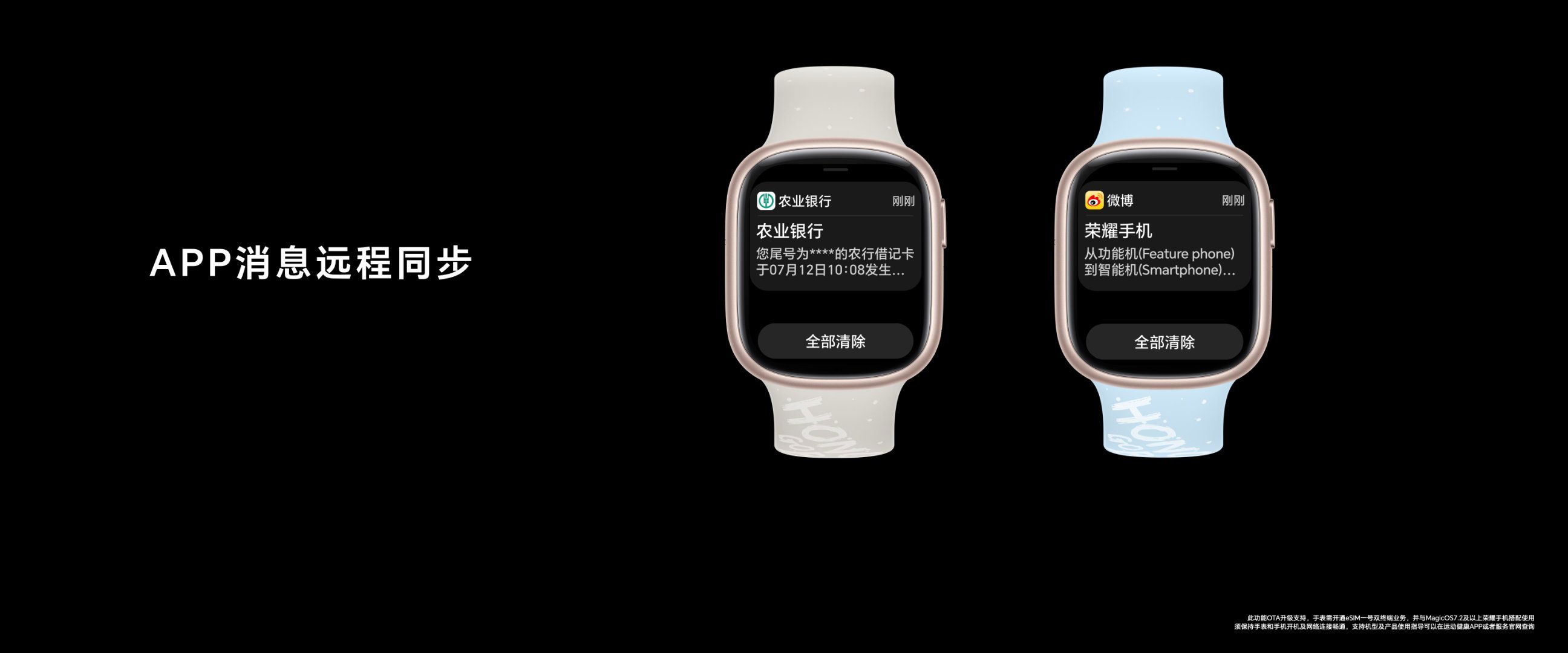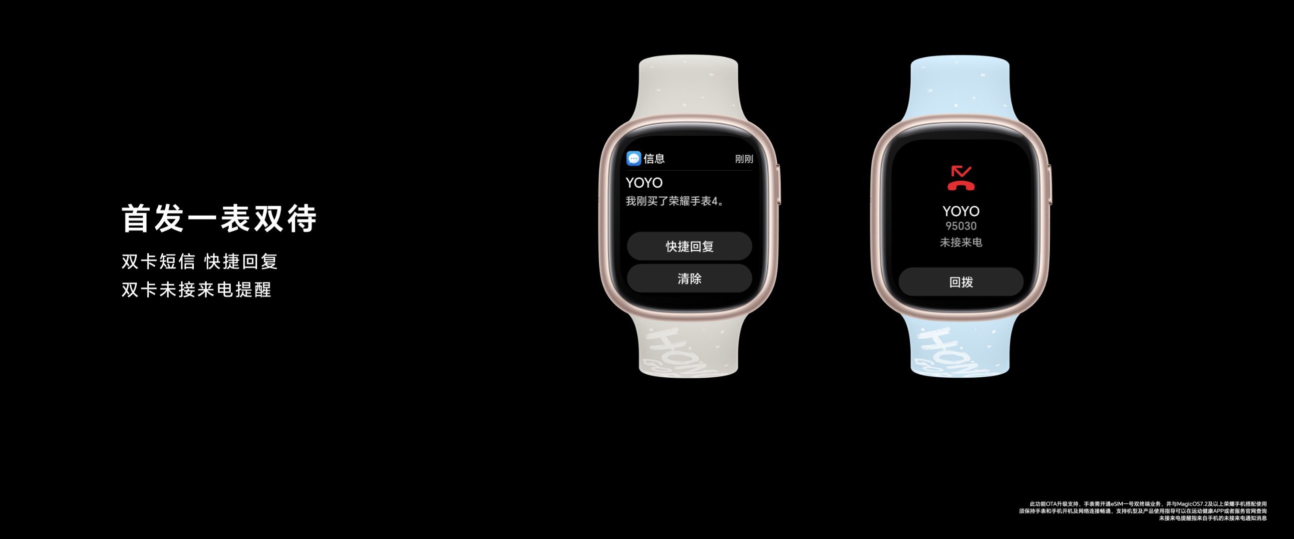 荣耀手表4支持eSIM独立通话,在MagicRing的加持下,智能手表可以与手机远场自动组网,手机消息不再遗漏,彻底告别手机信息焦虑。荣耀手表4首发“一表双待”功能,使手表能够接收到双卡的未接来电和短信,智能手表从此也拥有“双卡双待”的魅力!