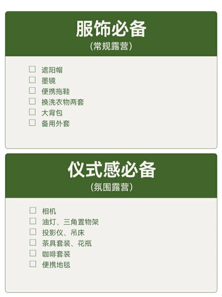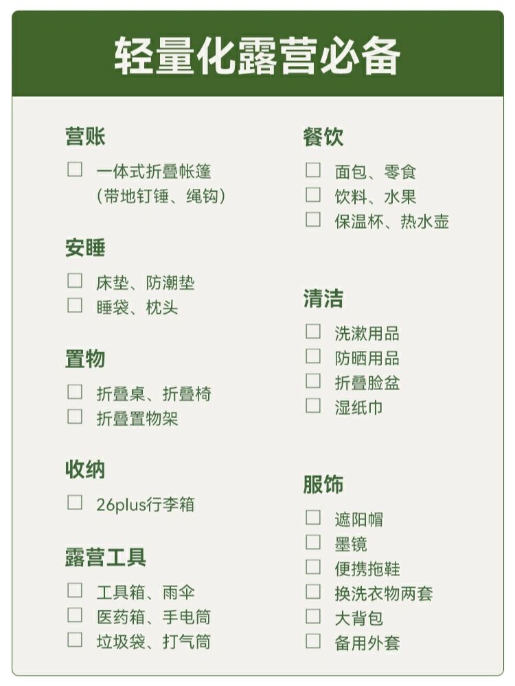 这就给大家列一个新手露营清单首先是新手入门级露营必备营账一体式折叠帐篷(带地钉锤、绳钩)安睡床垫、防潮垫、睡袋、枕头置物折叠桌、折叠椅、折叠置物架收纳26plus行李箱露营工具工具箱、雨伞、医药箱、手电筒、垃圾袋、打气筒餐饮面包、零食、饮料、水果、保温杯、热水壶清洁洗漱用品、防晒用品、折叠脸盆、湿纸巾服饰遮阳帽、墨镜、便携拖鞋、换洗衣物两套大背包、备用外套接下来是常规露营清单扎营营帐类、安睡用品、收纳必备、置物架、照明用品小蓝牙音箱、各种扎营工具(见清单)餐饮(大部分在露营基地都可以解决哦)露营厨具筷子勺子汤勺、水桶储水、折叠水杯折叠洗菜盆、调料套装、洗洁精、打火机、防烫手套清洁必备洗漱用品、防晒用品、折叠脸盆、湿纸巾、餐巾纸急救用品创可贴、云南白药喷雾、打火棒、消毒液、感冒药、退烧药、驱虫喷雾、防蛇咬工具包求生哨(一定要有)