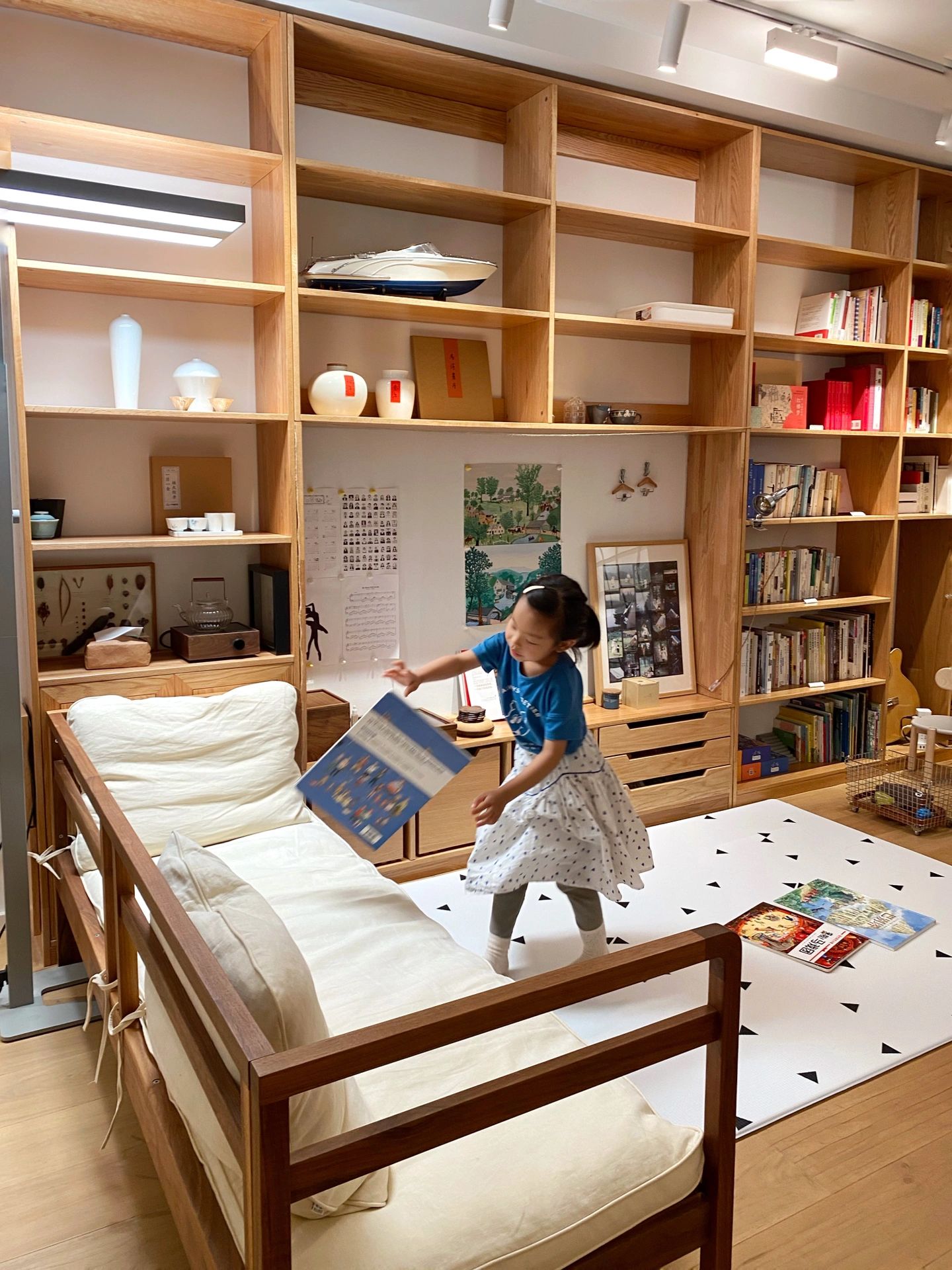 为了给玖宝一个自由发挥的游戏空间和读书空间,避免大人们窝在沙发开着电视各自刷手机,所以客厅放弃了【臃肿大沙发+茶几+电视墙】的传统布局,让读书和游戏成为客厅的主要活动,好的客厅设计和动线是可以改善家庭氛围的