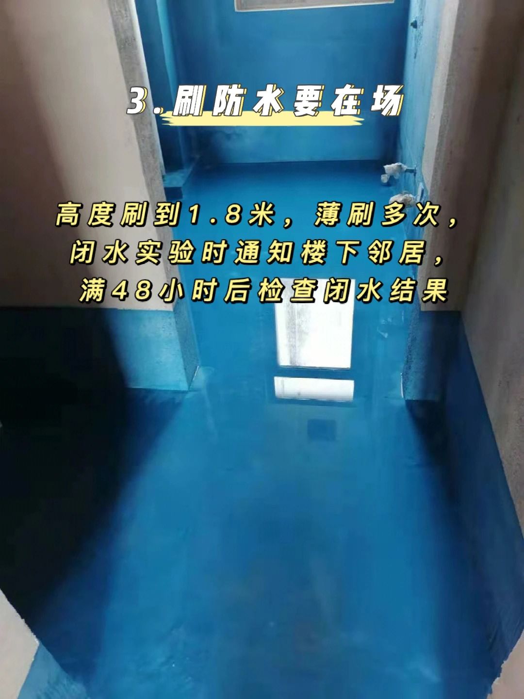 3️⃣刷防水要在场,高度刷到1.8米,薄刷多次,闭水实验时通知楼下邻居,满48小时后检查闭水结果