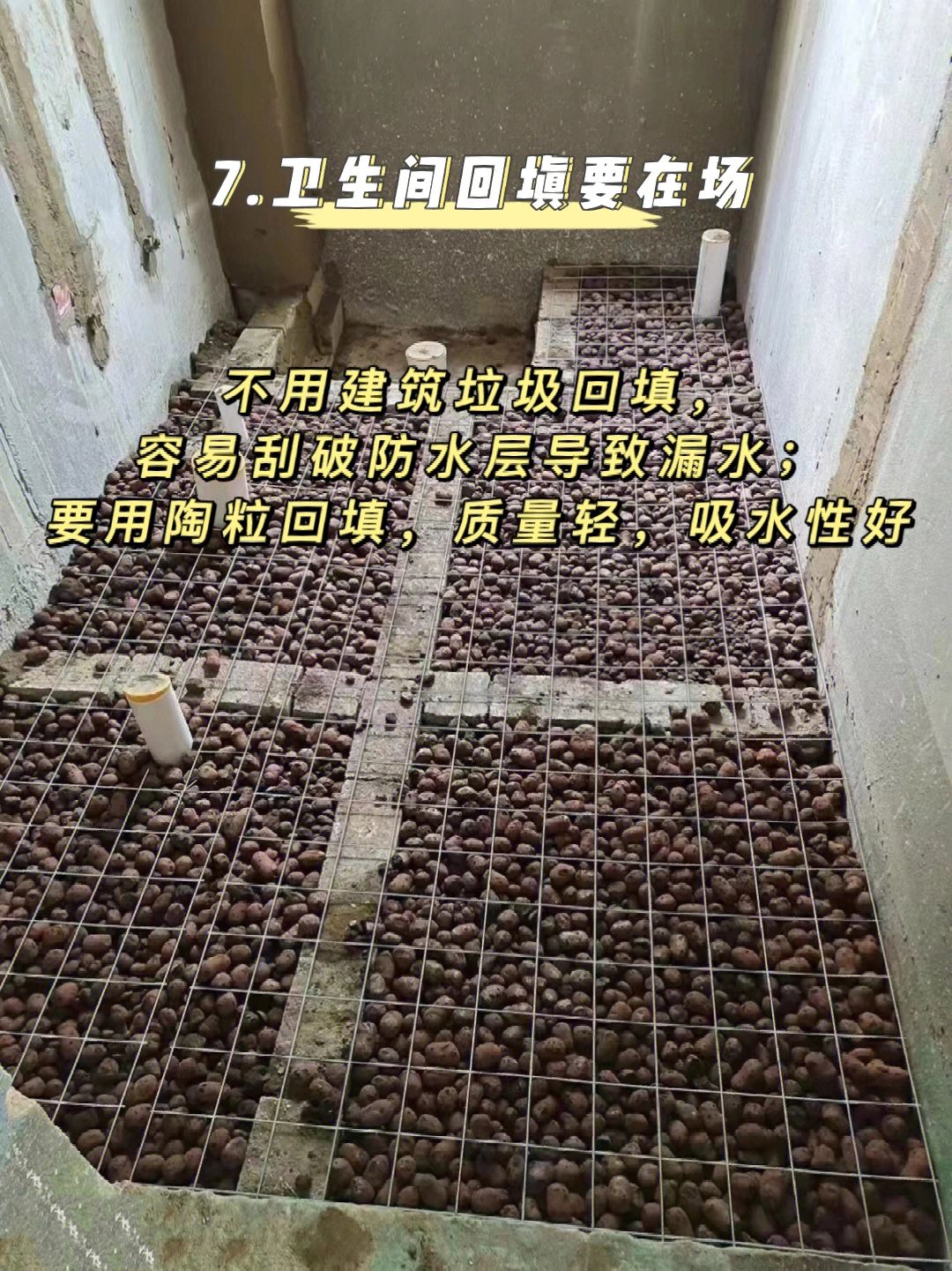 7️⃣卫生间回填要在场,不用建筑垃圾回填,容易刮破防水层导致漏水;要用陶粒回填,质量轻,吸水性好