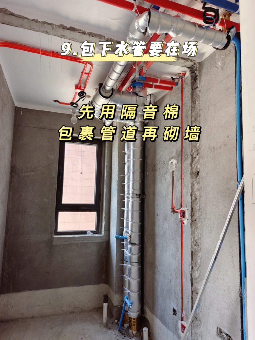 9️⃣包水管要在场,先用隔音棉包裹管道再砌墙