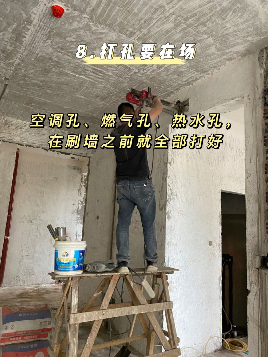 8️⃣打孔要在场,空调孔、燃气孔、热水孔,在刷墙之前就全部打好