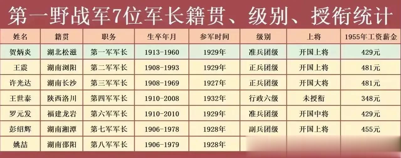 第一野战军军长籍贯、级别、授衔一览表。 7个军长中有一个大将军长,三个上将军长,二个中将军长,一个未授军衔。值得一提的是一野有四个唯一:第一军团是唯一一个三个军长都授上将的军团;第二兵团司令员兼第三军军长许光达是唯一的大将军长;“天下第一军”军长贺炳炎是唯一的准兵团级上将。另外第一兵团还是出“独臂将军”最多的兵团(贺炳炎上将、彭绍辉上将、余秋里中将,左齐少将都是独臂)。