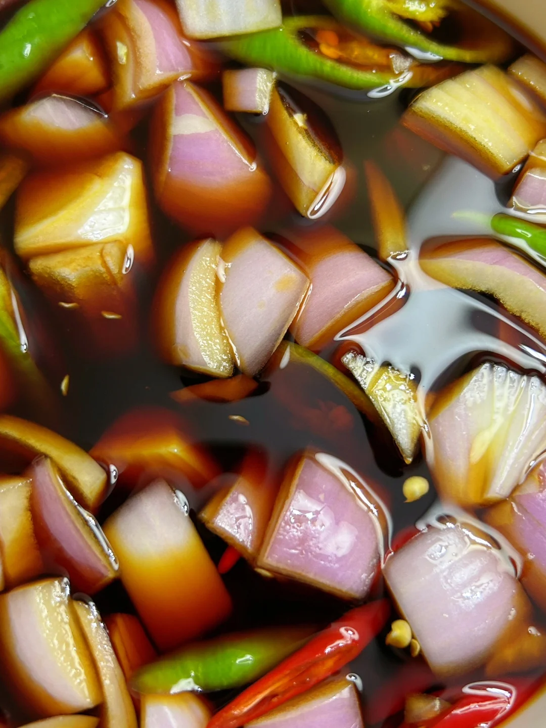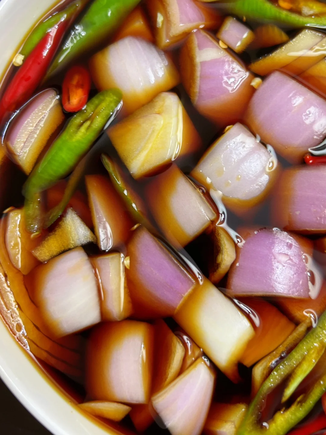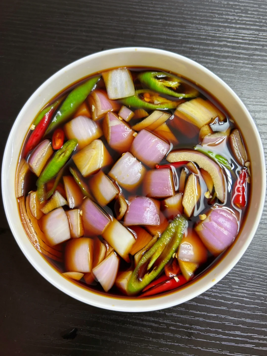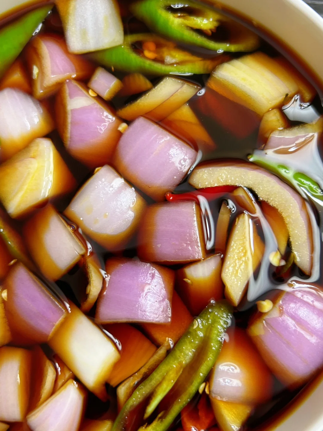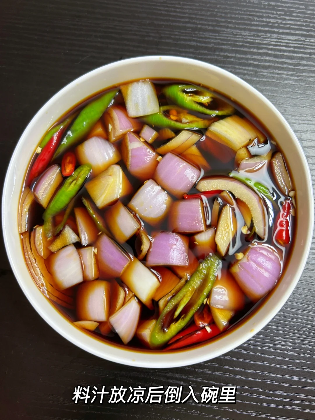 1⃣️洋葱、小米辣、线椒切好一起装盘 2⃣️调个料汁:250ml水、180ml生抽、100毫升陈醋、3勺白糖,大火煮开 3⃣️料汁放凉之后倒入碗里,放入冰箱冷藏 完成✅ 一般腌制2-3小时就好啦 如果放一夜更好吃更入味! 配上面条吃绝了!!
