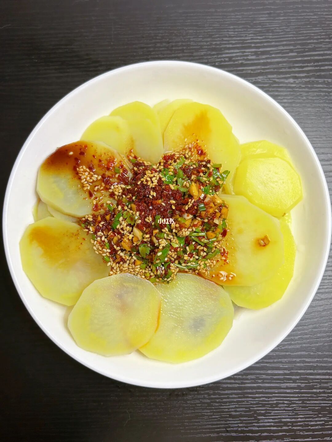 2⃣️土豆切片焯水,过一下凉水装盘,倒入料汁拌匀