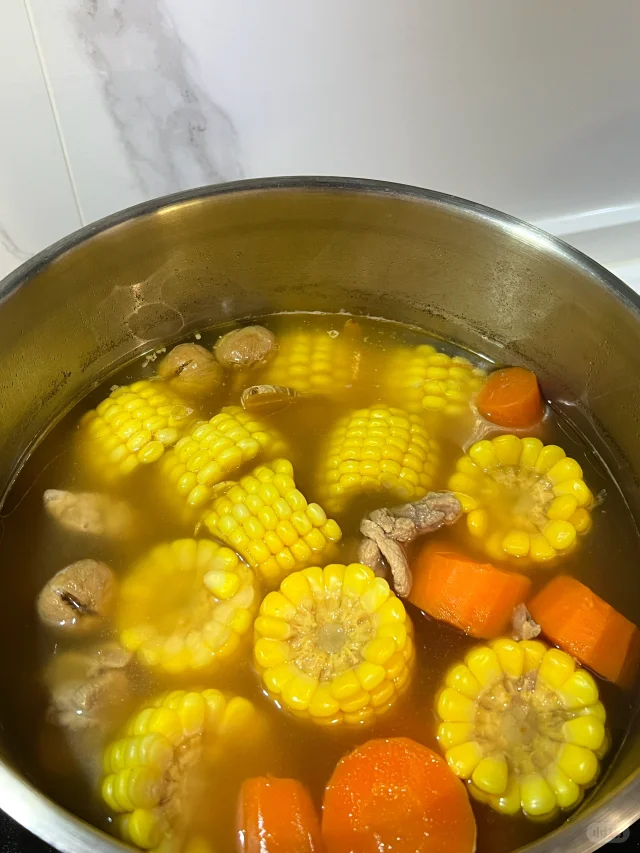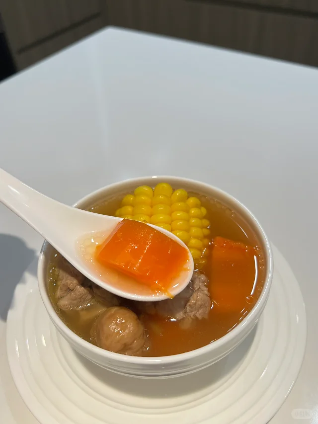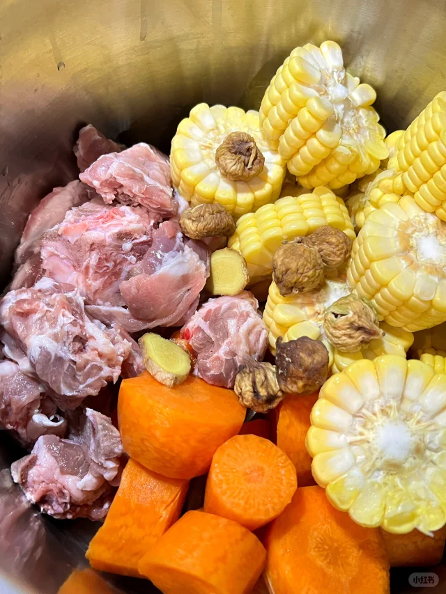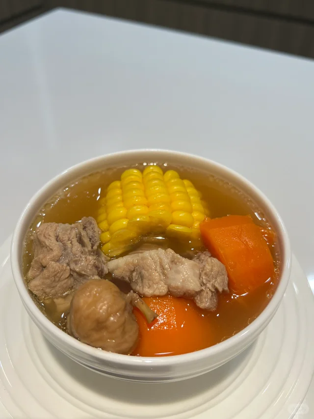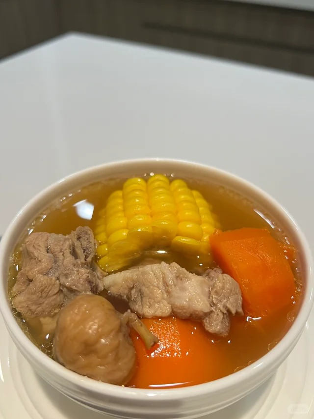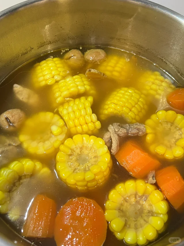 适合秋天喝的超简单老火汤! 🧑🍳食材: 1⃣️玉米两根 2⃣️胡萝卜两根 3⃣️排骨500g 4⃣️无花果一小把 5⃣️生姜两片 🥘做法: 1⃣️排骨泡出血水至发白沥干水分备用。 2⃣️胡萝卜玉米切段。 3⃣️将所有食材放入锅中,加入2升清水,大火烧开后小火煲2小时即可。 ❗️小贴士: 1⃣️选用瘦一点的排骨,扇骨,龙骨,煲出来的汤不油腻。 2⃣️没有无花果可以不放。