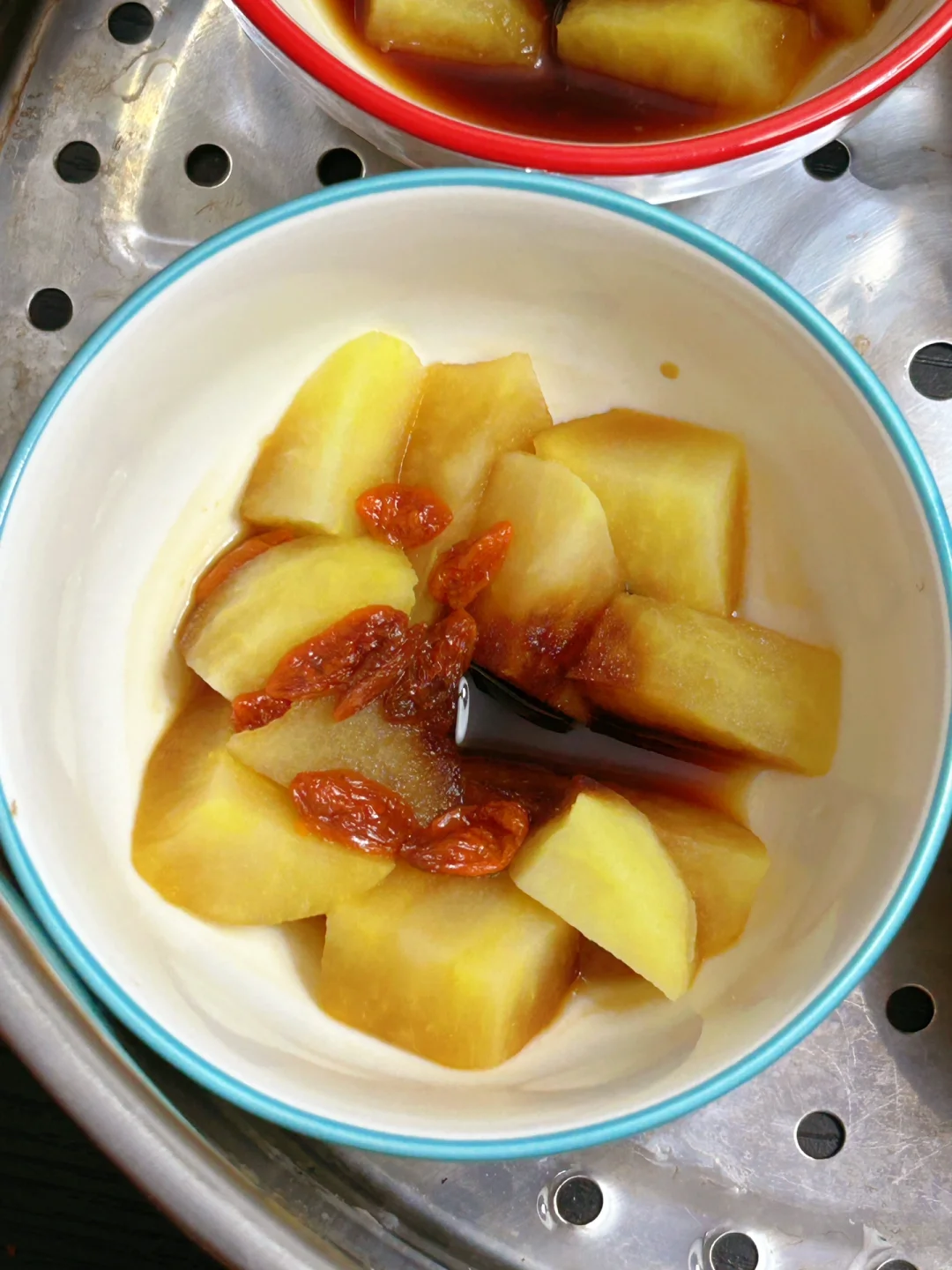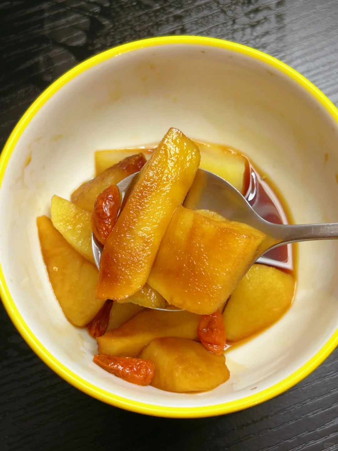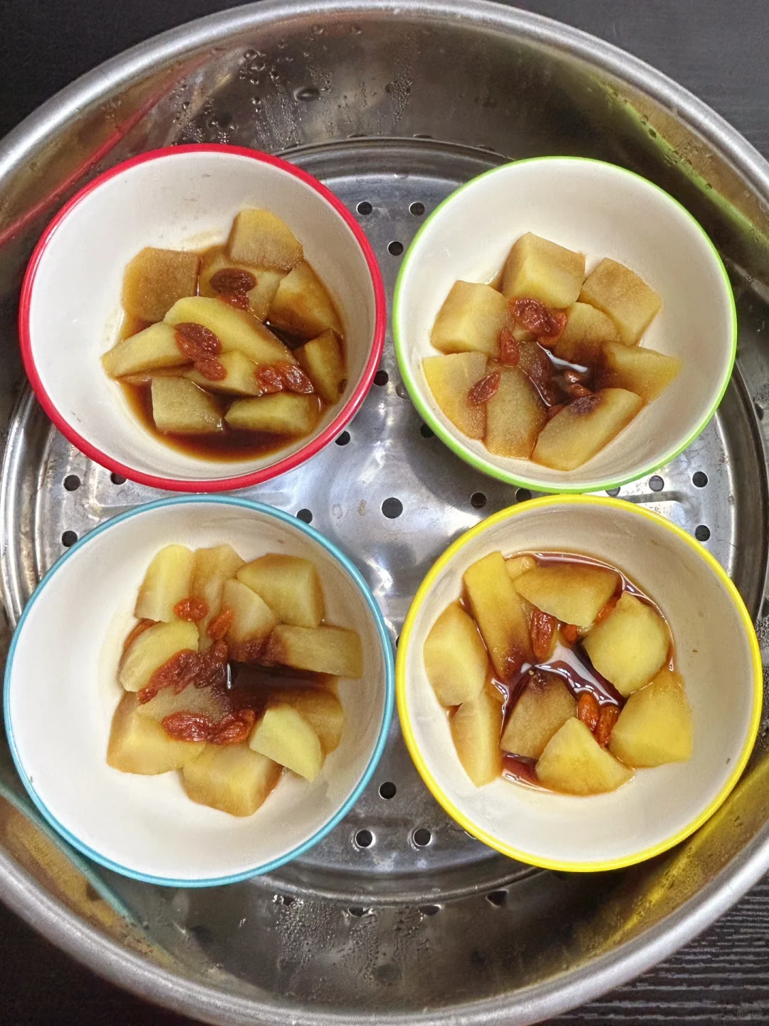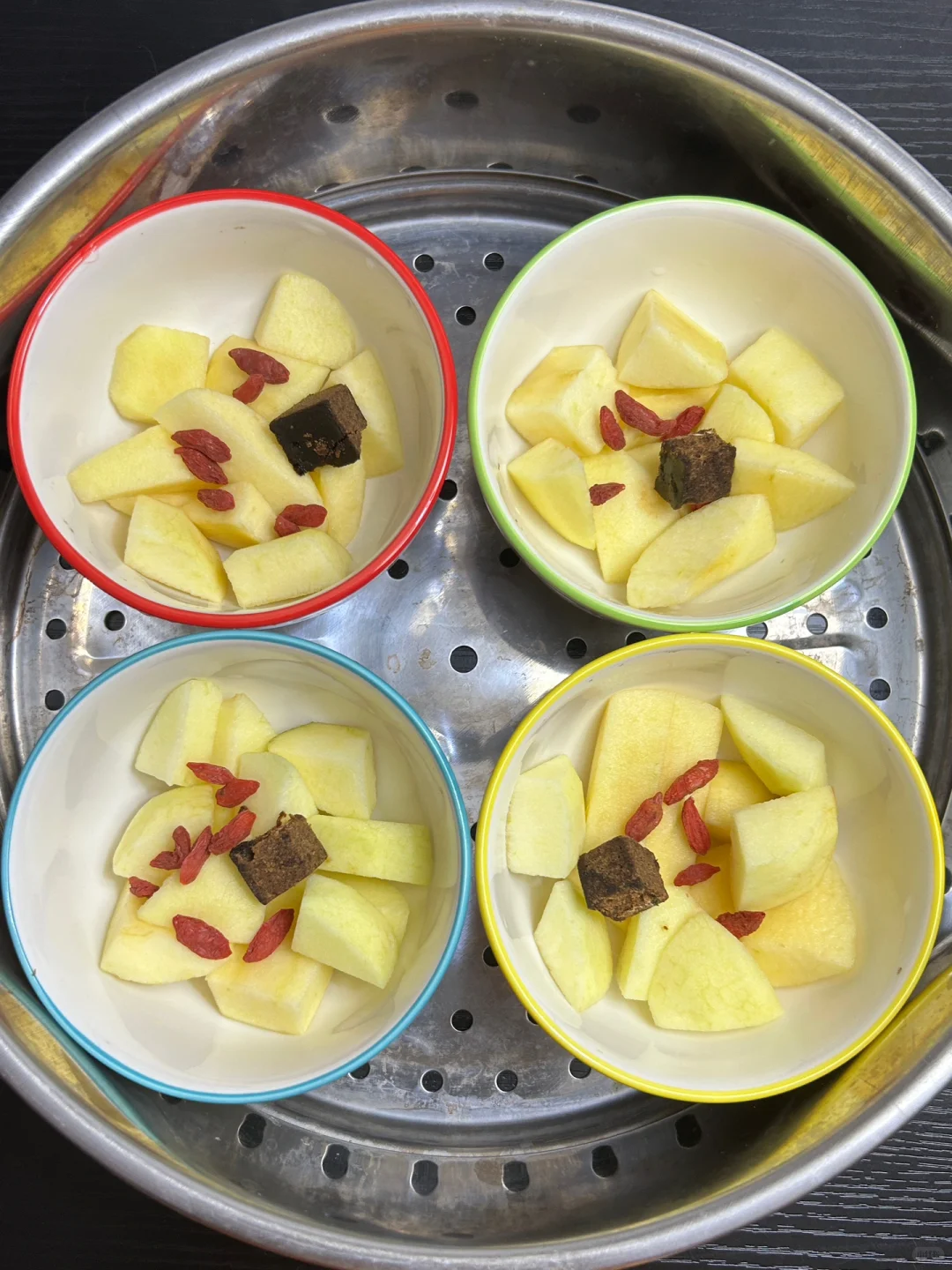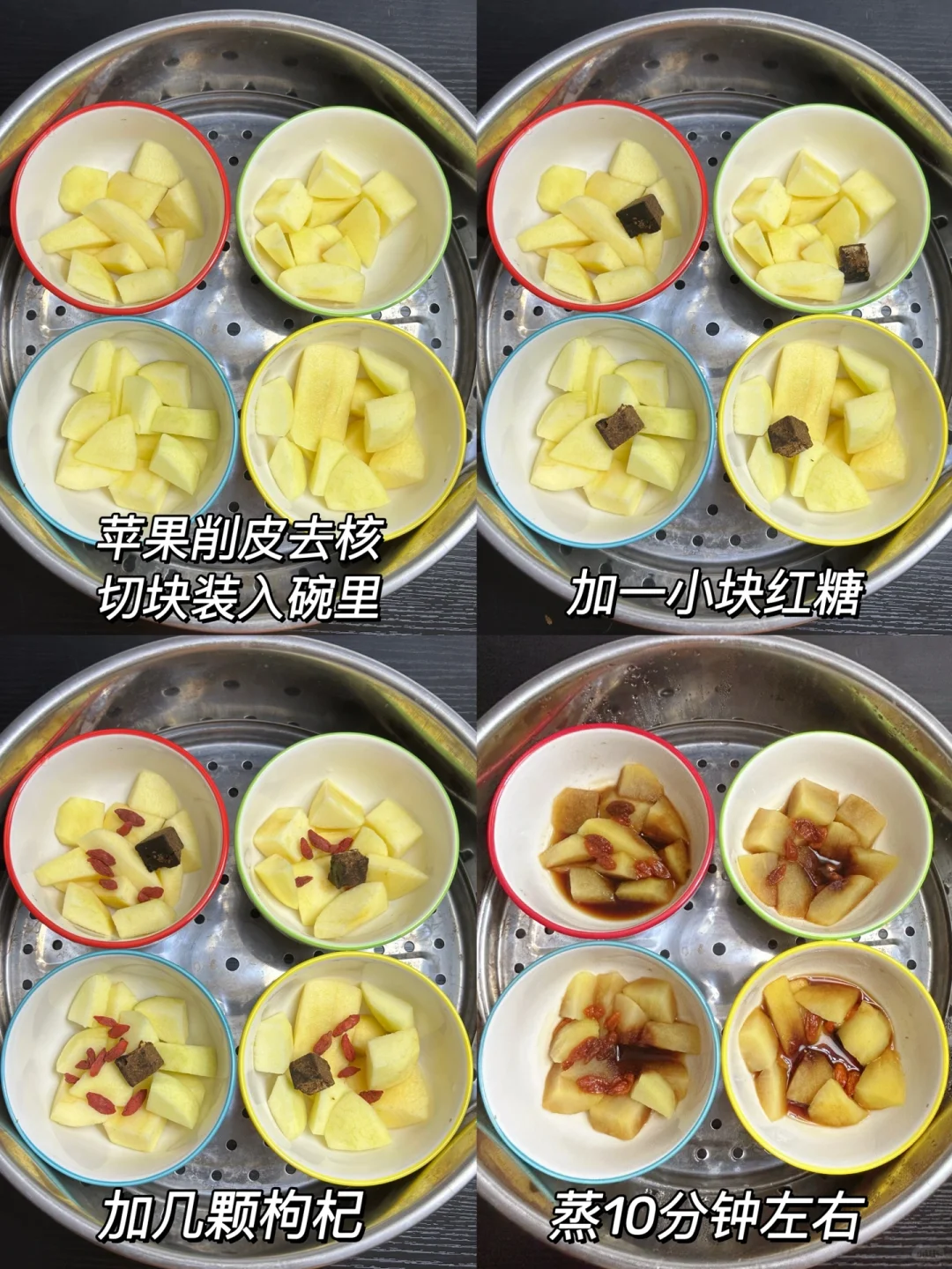 脾胃不好的姐妹都来试试这个蒸苹果 吃完超舒服的!! 酸酸甜甜的特别好吃!! 做法也很简单!! 1⃣️苹果削皮(皮不好消化),把苹果核也去掉,切成块装入碗里 2⃣️加入1小块红糖,再加几粒枸杞,大火蒸10分钟 完成✅ 每天吃一小碗 真的舒服多了!! 太适合秋冬了!