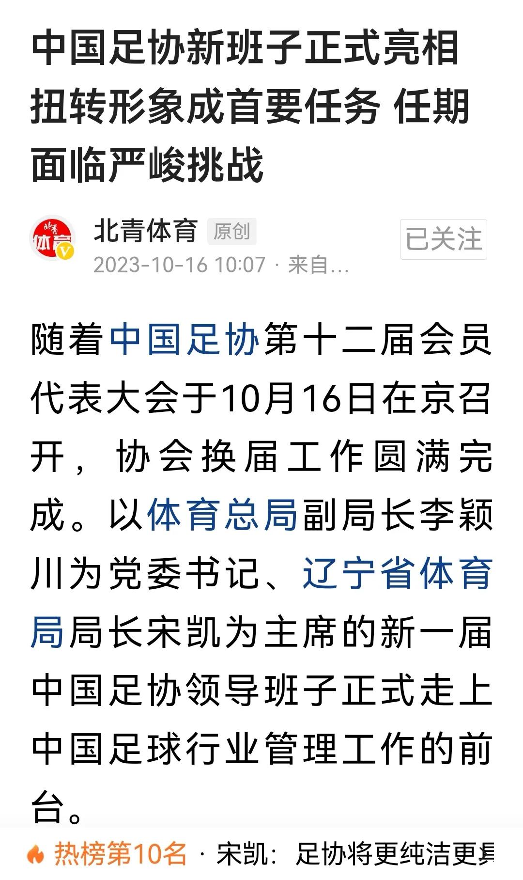 官宣:足代会确定宋凯当选足协主席,孙雯足协副主席!高洪波辞去副主席职务,出任技术总监。 10月16日,中国足协第十二届会员代表大会在北京召开。足代会上,进行了换届选举,新一届中国足协领导班子全面亮相,辽宁体育局局长宋凯当选足协主席,孙雯、袁永清、杨旭、许基仁出任副主席,袁永清兼任秘书长,中国足协上一届领导班子中,仅副主席孙雯留任,高洪波辞去副主席职务,出任技术总监。体育总局副局长李颖川,正式出任新一届中国足协党委书记。 宋凯当选新一届中国足协主席后作了一番主题讲话。他强调,自己及新一届中国足协将坚定信心,卧薪尝胆,埋头苦干,重整旗鼓走好中国足球新的长征。 宋凯在任期间,辽宁男篮拿下了3个CBA总冠军,被视为抓三大球训练有成效。今年3月底,体育总局局长高志丹一行前往辽宁调研“三大球”发展工作并举行座谈会,座谈会上,正是宋凯介绍了辽宁“三大球”振兴发展的思路和举措。 中国足协主席的工作,也是压力山大。但愿这次换将,能给中国足球带来些许改善。#妙笔生花创作挑战# #中国足球#